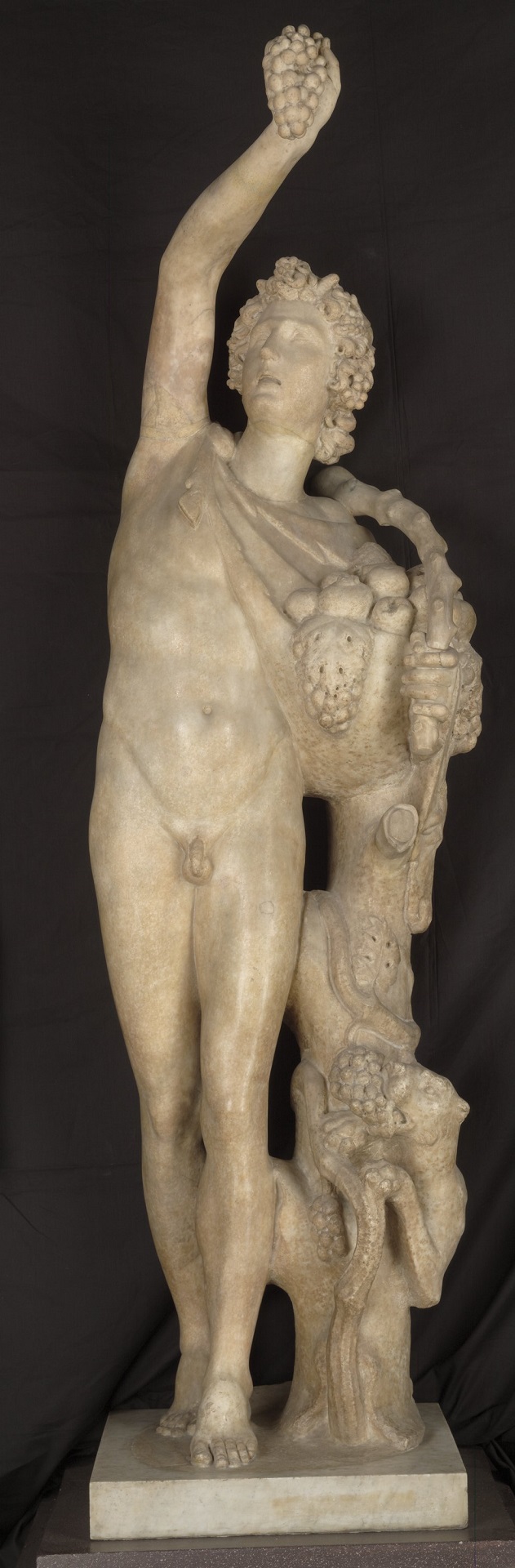 Inizialmente compresa nelle collezioni romane dei Della Valle, questa scultura fu acquista dai Medici nel 1584, giungendo tuttavia a Firenze da Villa Medici solo nell’ultimo ventennio del Settecento. Il soggetto raffigurato rappresenta un giovane satiro, accompagnato da una pantera, che porta in spalla una pelle di un cerbiatto (nebris), utilizzandola come sacca per la frutta. Il personaggio si appoggia a un tronco d’albero, da dietro al quale fa capolino una piccola pantera. Ispirato a un possibile prototipo bronzeo, databile genericamente al II-I secolo a.C., il soggetto fu più volte copiato in età imperiale, trovando forse impiego come ornamento da giardino. Per l’abbondante presenza di tracce di lavorazione da trapano – soprattutto nella resa della frutta – si ipotizza per quest’opera una datazione all’avanzato II secolo d.C.