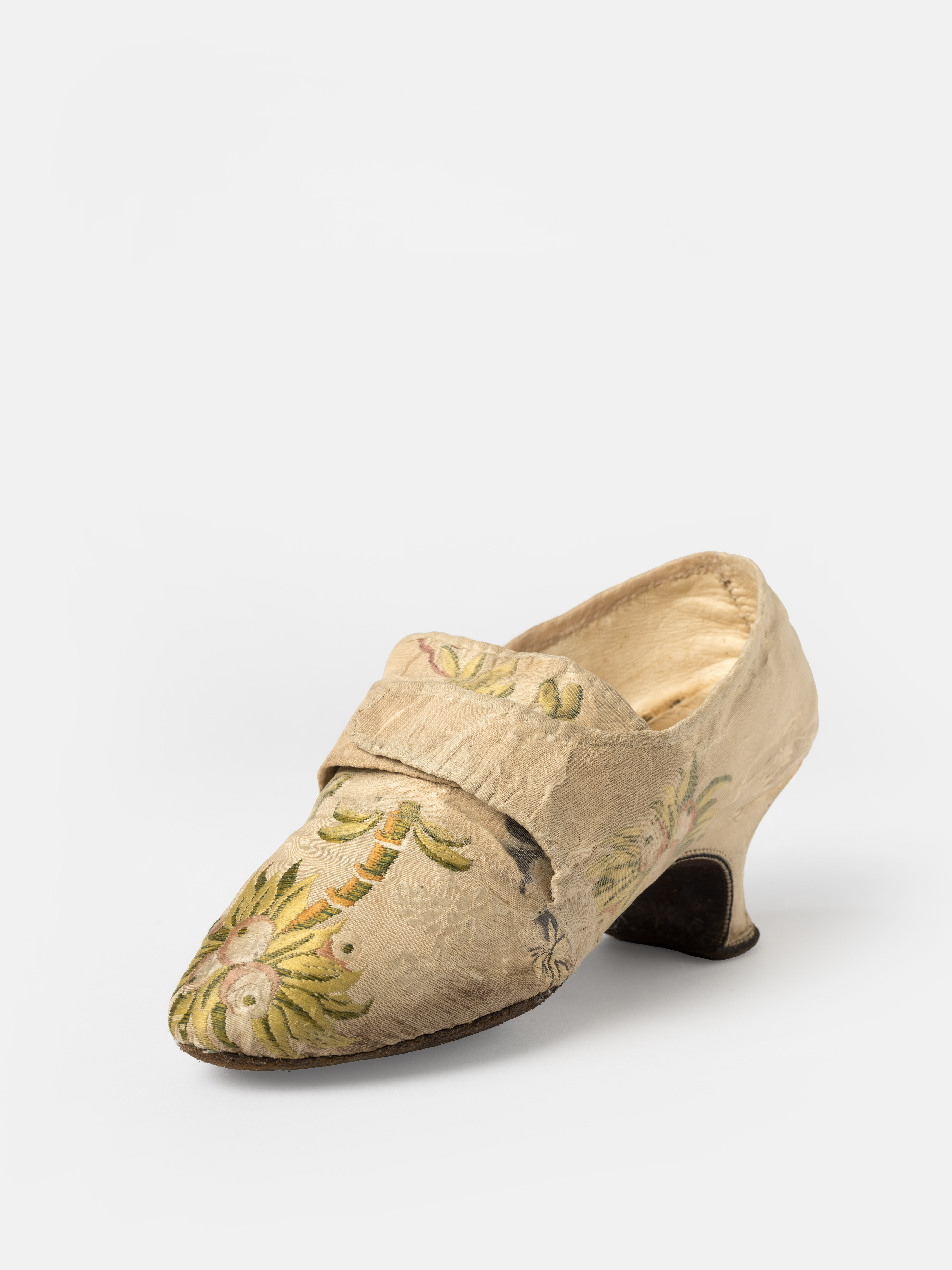Scarpa in gros de Tours liseré a fondo avorio con motivi a meandro con elementi stilizzati architettonici e floreali di gusto esotico broccati in sete policrome. Due cinturini partono dai quartieri e si incrociano sulla linguetta dove originariamente erano fermati da una fibbia. Punta leggermente sfilata e montante.