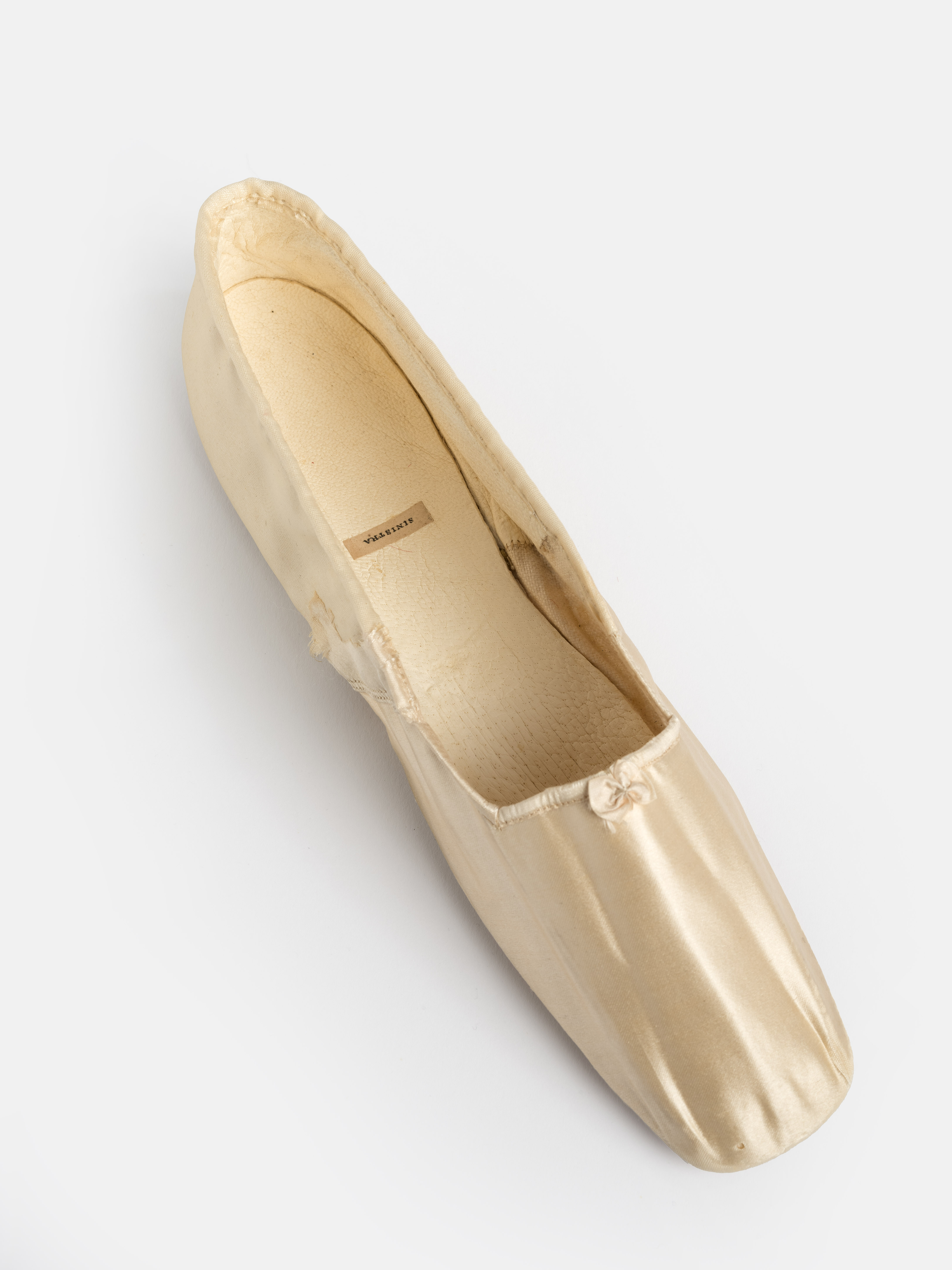 Scarpe in raso avorio con fodera in lino e capretto, suola in cuoio con rinforzo interno, elastico.