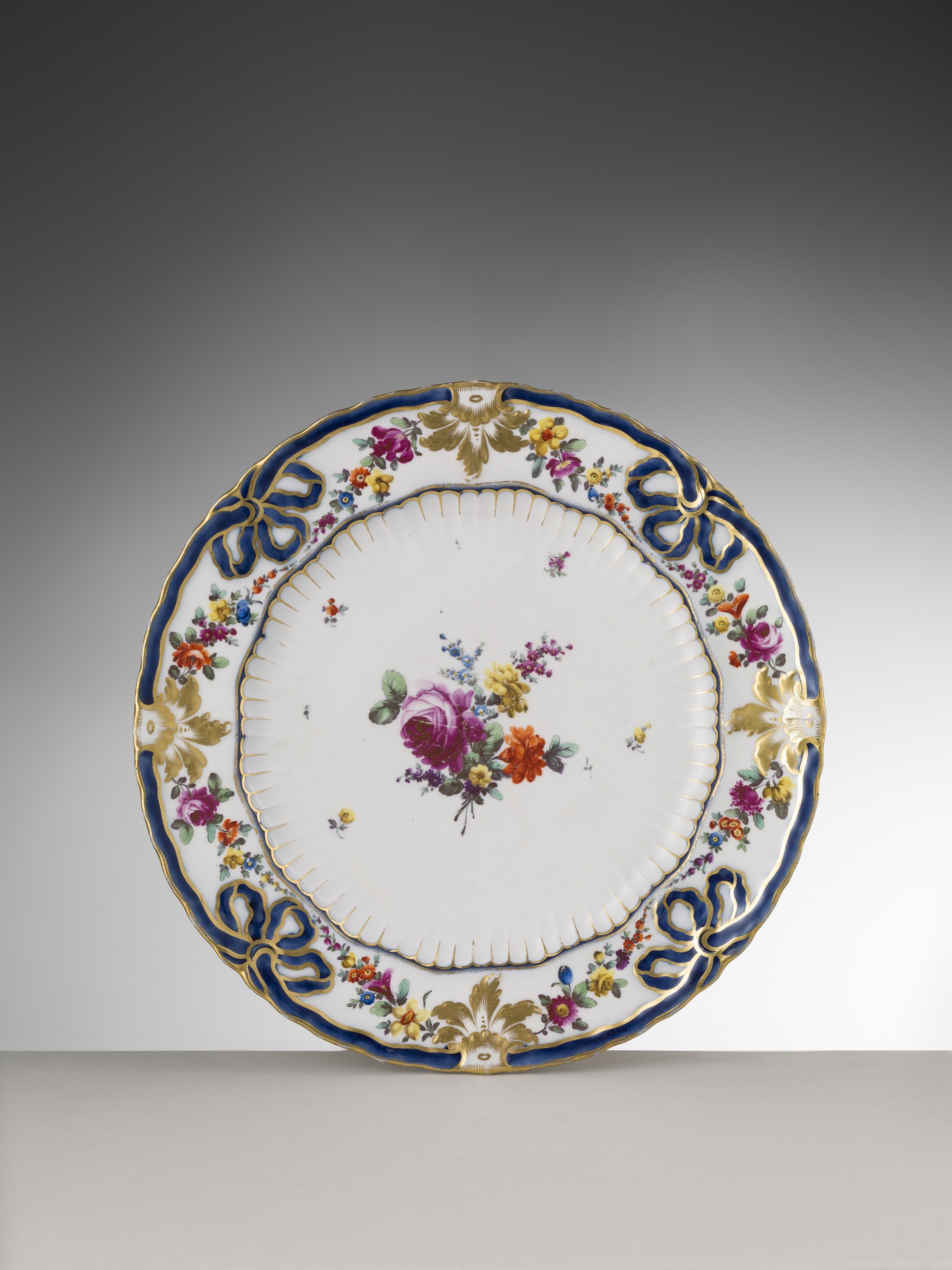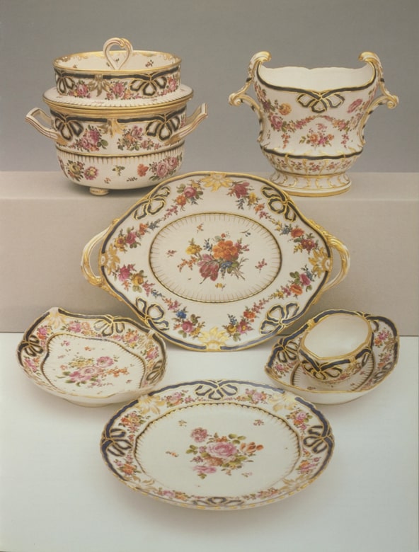 Questo servizio è assortito sia per la tavola che per il dessert ed è stato commissionato dal granduca Pietro Leopoldo Asburgo Lorena alla manifattura di Corte della madre, Maria Teresa d’Austria. Nella scelta del decoro con ghirlande di fiori intervallate da nastri blu scuro con rifiniture in oro, in effetti, trapela il gusto dell’imperatrice. L’attuale servizio presenta pezzi eseguiti dalla Manifattura Ginori che nel 1785 fu incaricata dal granduca di realizzare ‘rimpiazzi’, ad esempio, di piatti rotti. Con molta probabilità nel medesimo anno, essa eseguì anche una fedele replica dell’intero servizio, sempre su commissione del granduca per la sorella Maria Amalia, consorte di Ferdinando di Borbone duca di Parma e Piacenza.
