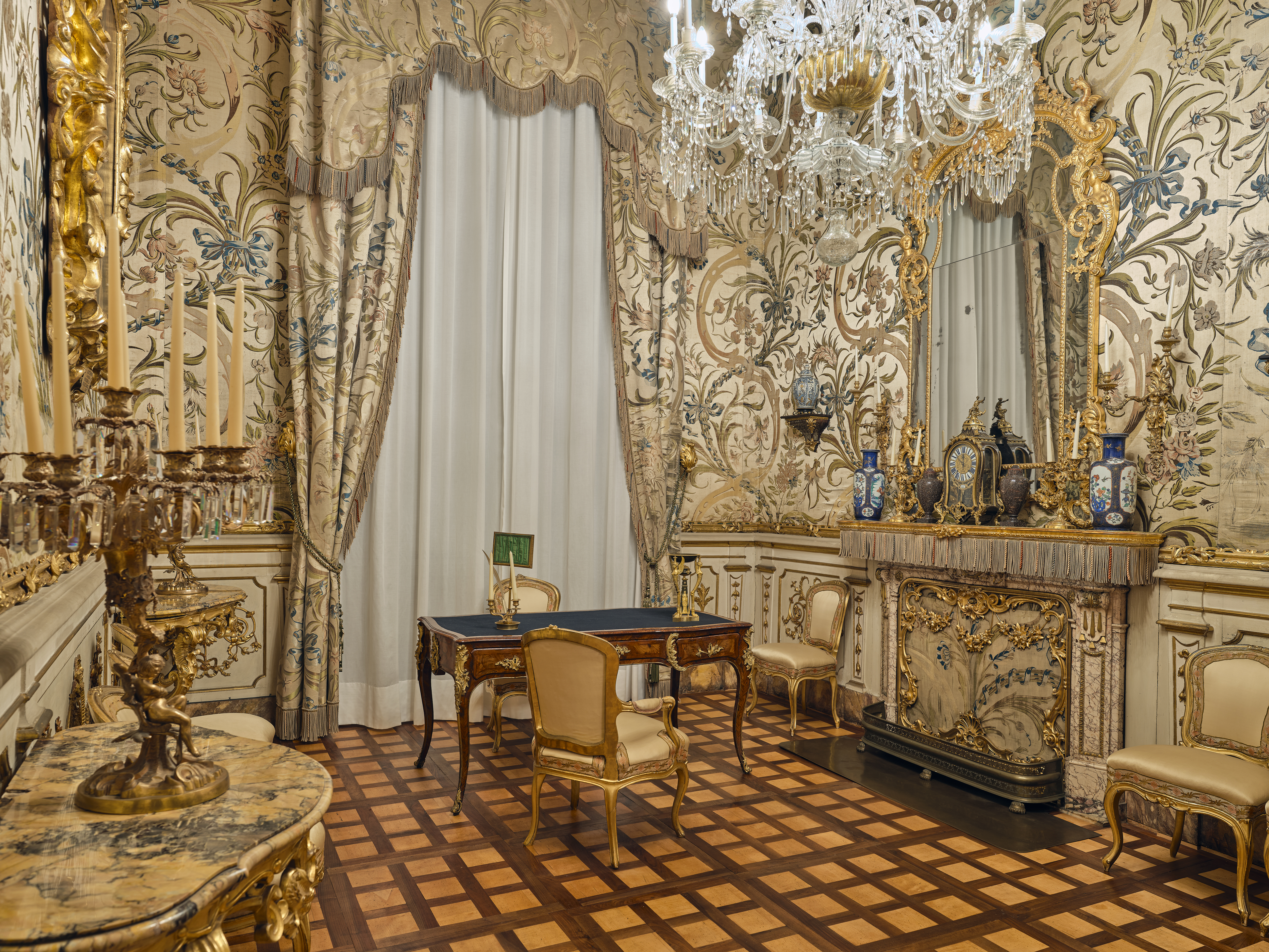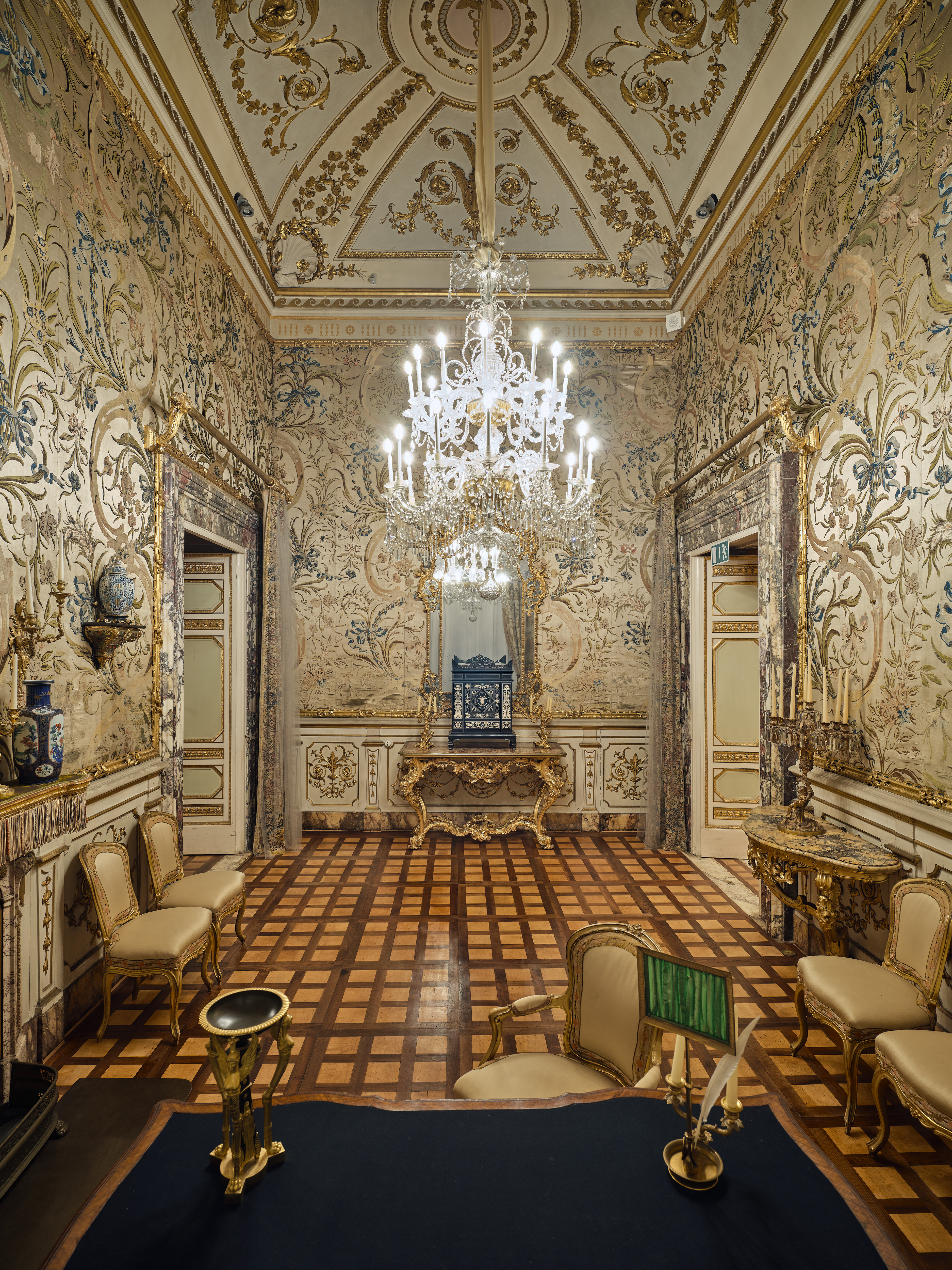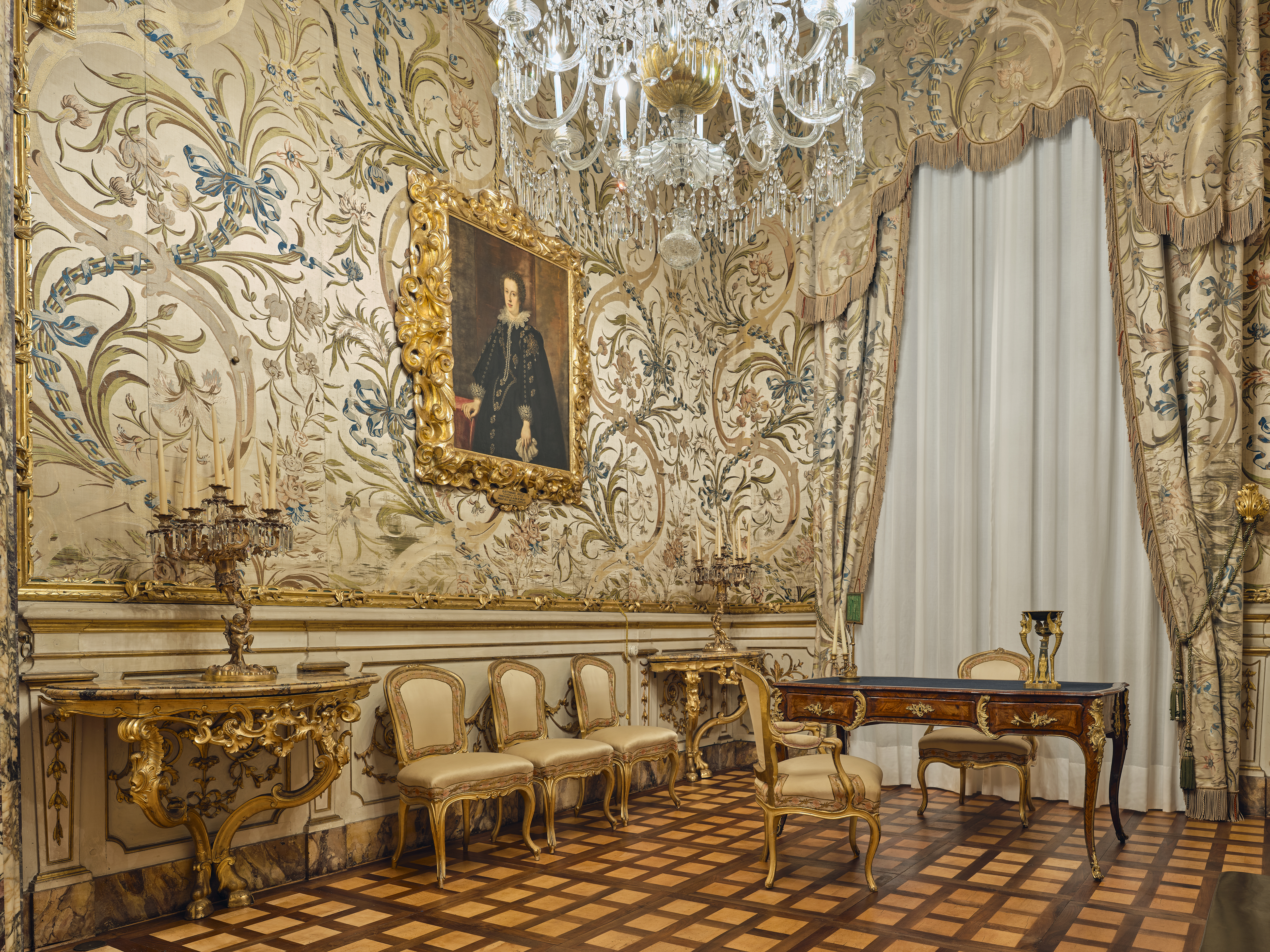Quanto al parato, montato in questo ambiente solo nel 1899, sappiamo che risultava consegnato alla Guardaroba nel 1770 per essere destinato in origine a una degli ambienti nell’appartamento della granduchessa. Di colore bianco, secondo la preferenza cromatica del periodo, e arricchito di nervosi ramages dorati, con fiori rosa e fiocchi Luigi XVI celesti, appare di una qualità confrontabile con le pregiate sete di Lione, ma fu acquistato dalla Fabbrica Imperiale e Reale di Firenze, secondo un preciso ordine di Pietro Leopoldo di Asburgo Lorena, che intendeva così sostenere e incrementare l’industria serica locale, figlia di una antichissima tradizione locale che in età medievale, con l’Arte della Seta, era pilastro della società civile ed economica cittadina.