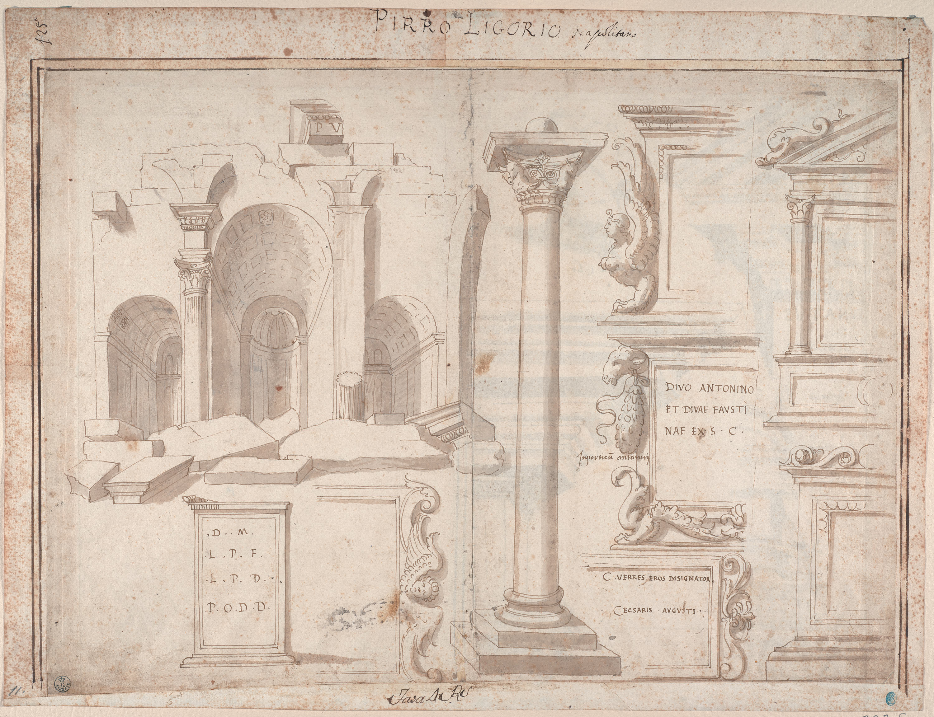 Uno degli elementi più interessanti con cui Ligorio si confronta in questo caso, sul recto del foglio, è l’iscrizione del tempio votato dal senato nel 141 d.C. in onore della diva Faustina, moglie del principe Antonino Pio (138-161 d.C.) e divinizzata subito dopo la morte, avvenuta a breve distanza dalla salita al potere del marito, dedica alla quale nel 161 d.C. sarebbe stata aggiunta la prima linea, che consacrava l’edificio anche al nuovo divo Antonino: Divo Antonino et / Divae Faustinae ex s(enatus) c(onsulto) (CIL VI 1005 = CIL VI 31224). Il testo, riprodotto in modo corretto se non per l’errata divisione in linee – circostanza comprensibile dato l’interesse di Ligorio per l’epigrafia – è messo correttamente in relazione col monumento cui apparteneva grazie alla didascalia che lo affianca: In porticu Antonini. L’approccio all’analisi del monumento da parte di Ligorio è certamente parziale, soprattutto se confrontato con quello del contemporaneo Giovanni Antonio Dosio, ma testimonia il fascino che il maestoso edificio era in grado di esercitare ancora nel XVI secolo, simbolo perenne dell’importanza attribuita a Faustina Maggiore all’interno del sistema dinastico di cui ella, in quanto Augusta in vita e diva dopo la morte, costituiva un elemento fondamentale. Una centralità evidenziata dal luogo stesso scelto per omaggiarla, uno spazio pubblico e tradizionalmente “maschile” qual era il foro repubblicano, nel quale ormai avevano diritto ad essere ricordate anche le matrone della famiglia imperiale.