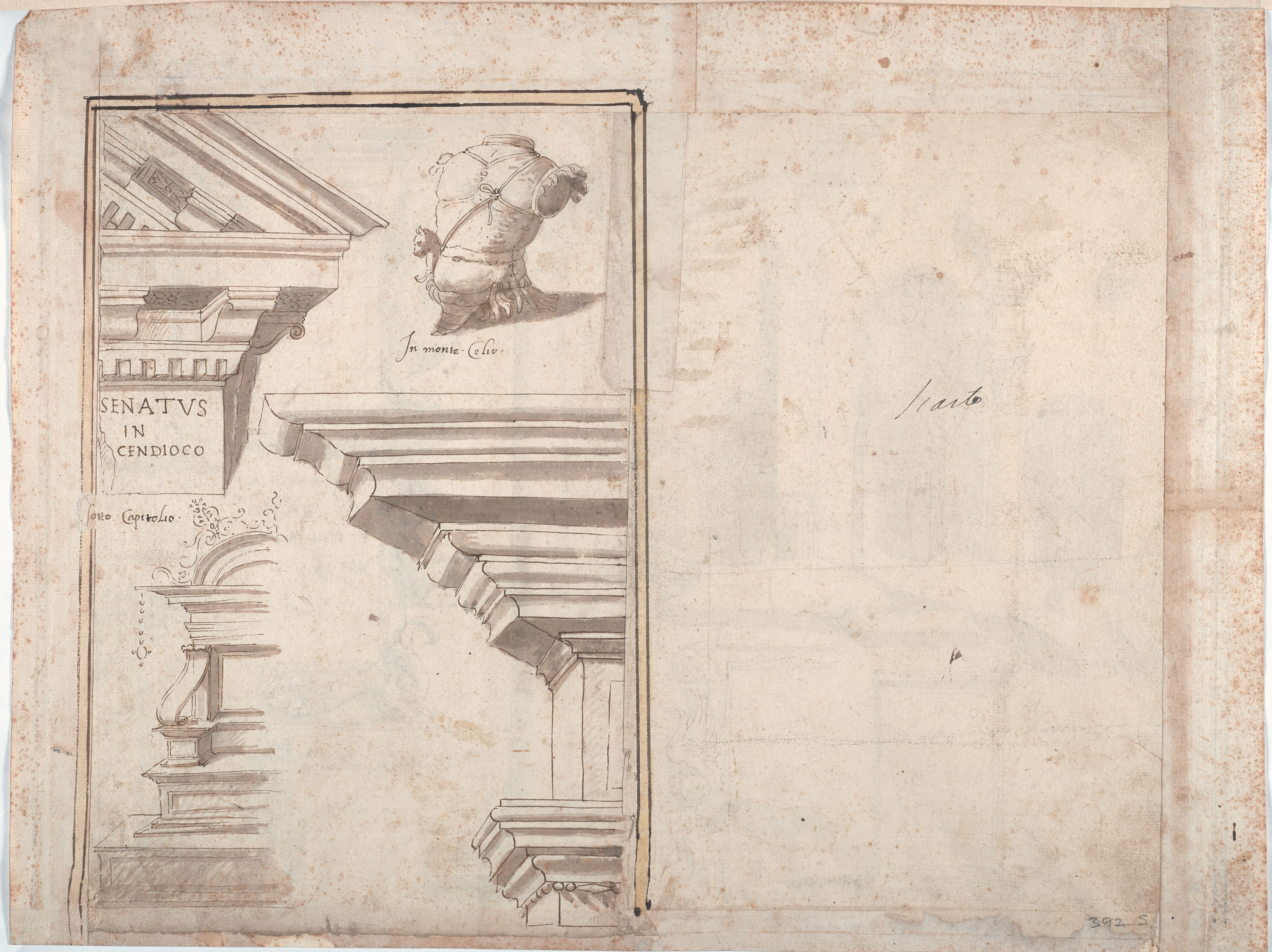 Su entrambi i lati di questo foglio (recto e verso) Pirro Ligorio si dedica ad un collage di gusto antiquario, la riproduzione di alcuni dei particolari architettonici, scultorei ed epigrafici che alla metà del XVI secolo si potevano ammirare nel foro romano e nelle zone limitrofe, particolari che l’antiquario napoletano poté disegnare dal vero nel suo lungo soggiorno romano, dagli anni ’30 agli anni ’60 del secolo.
