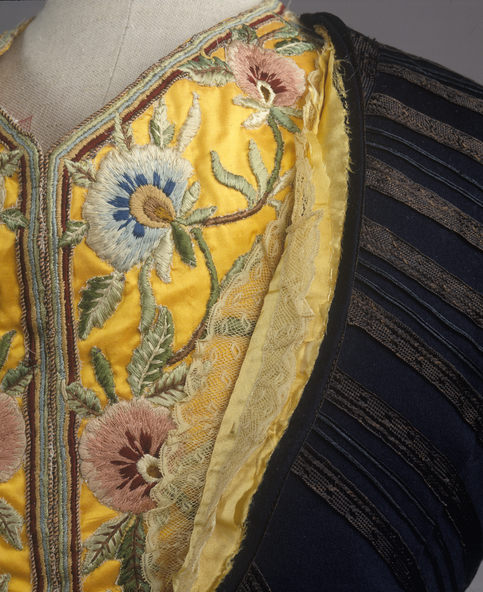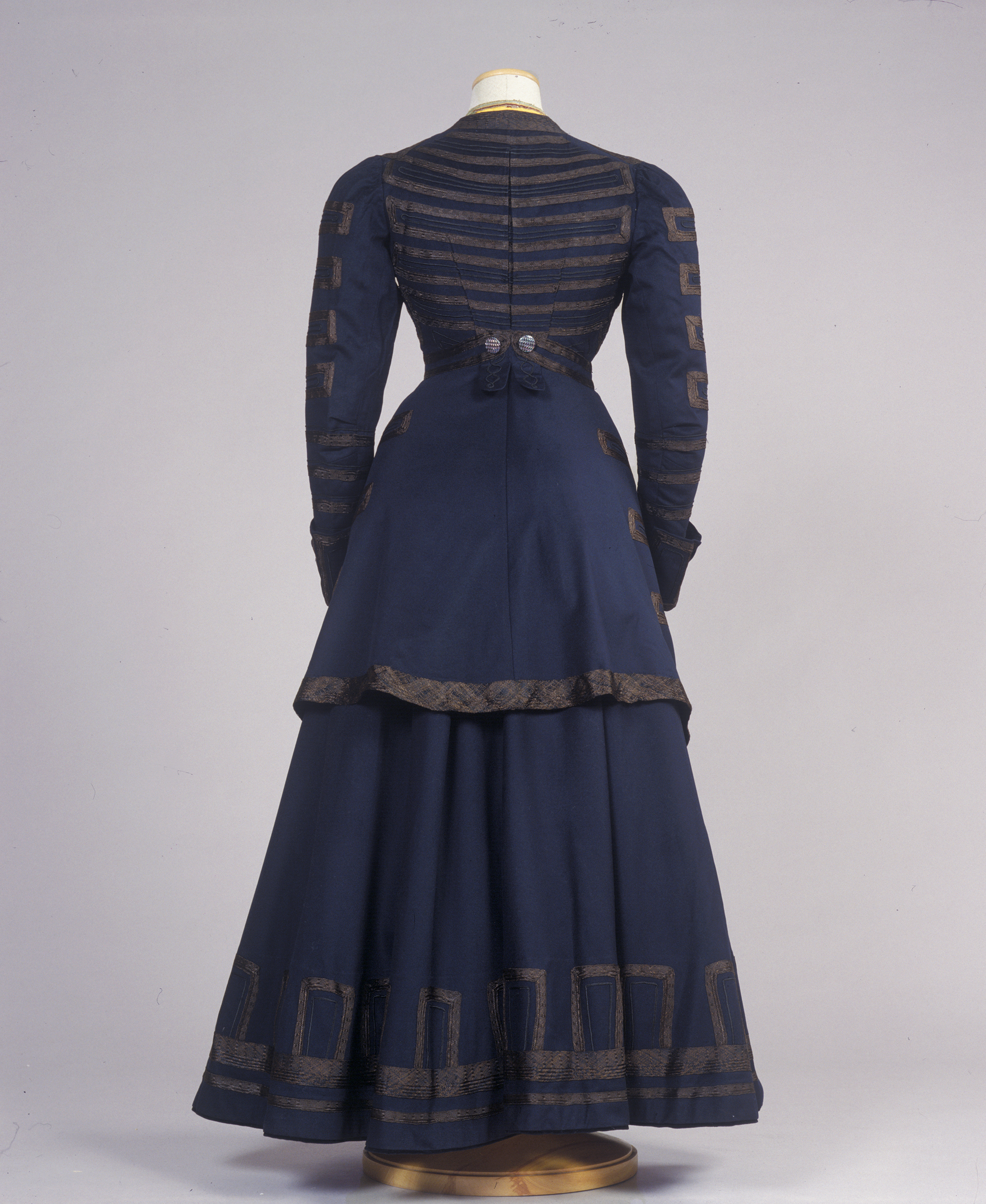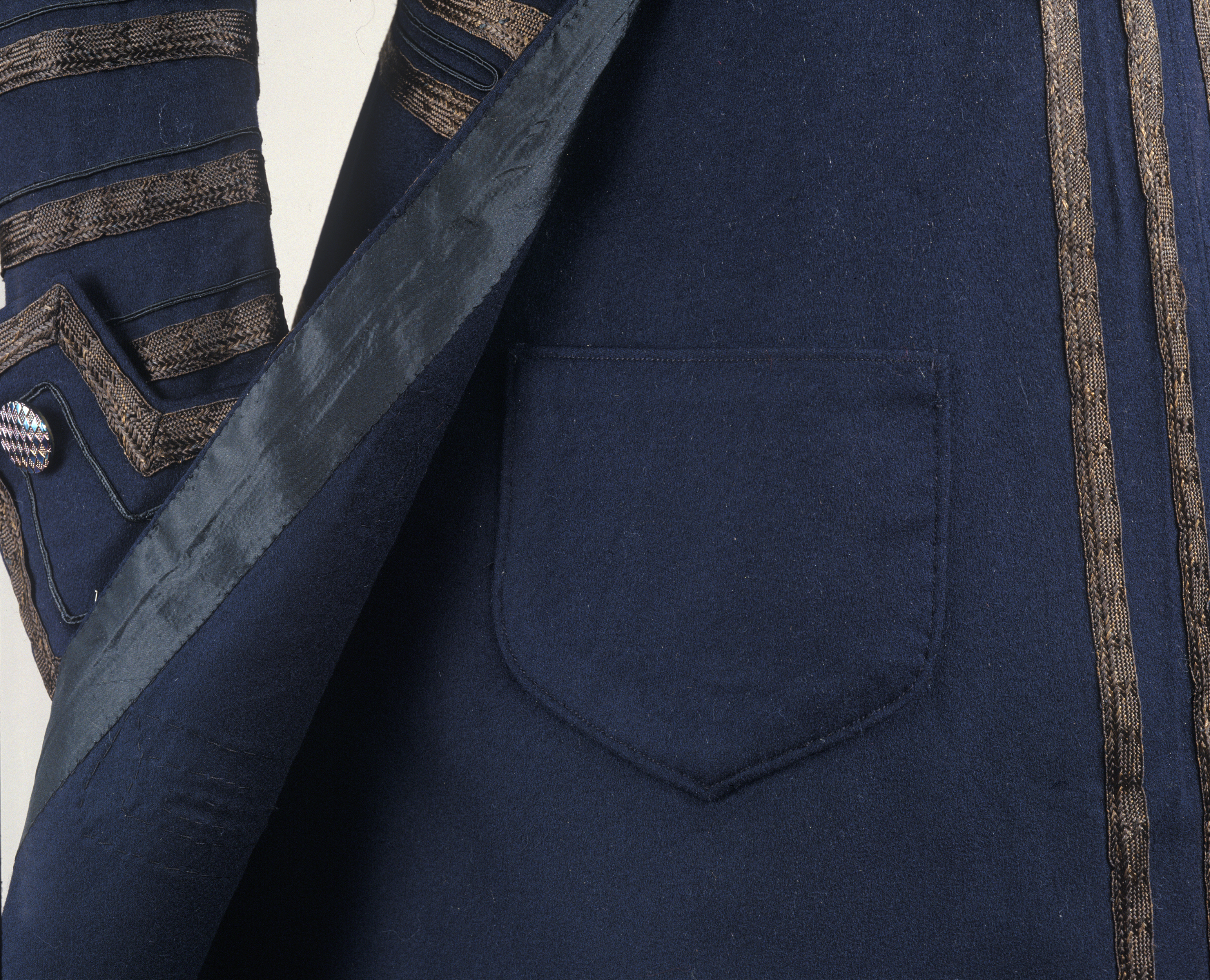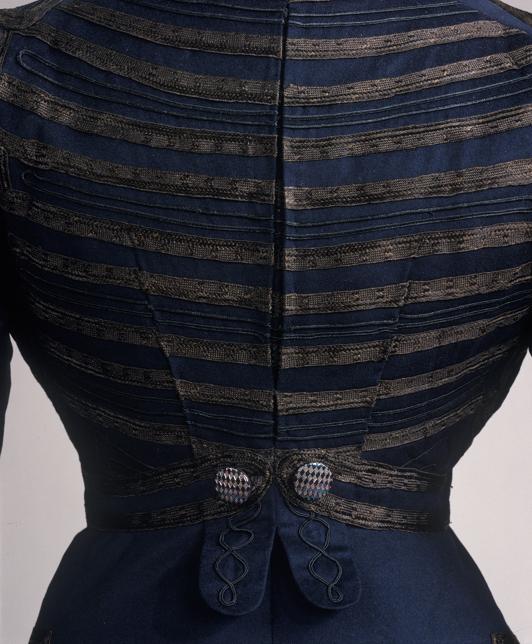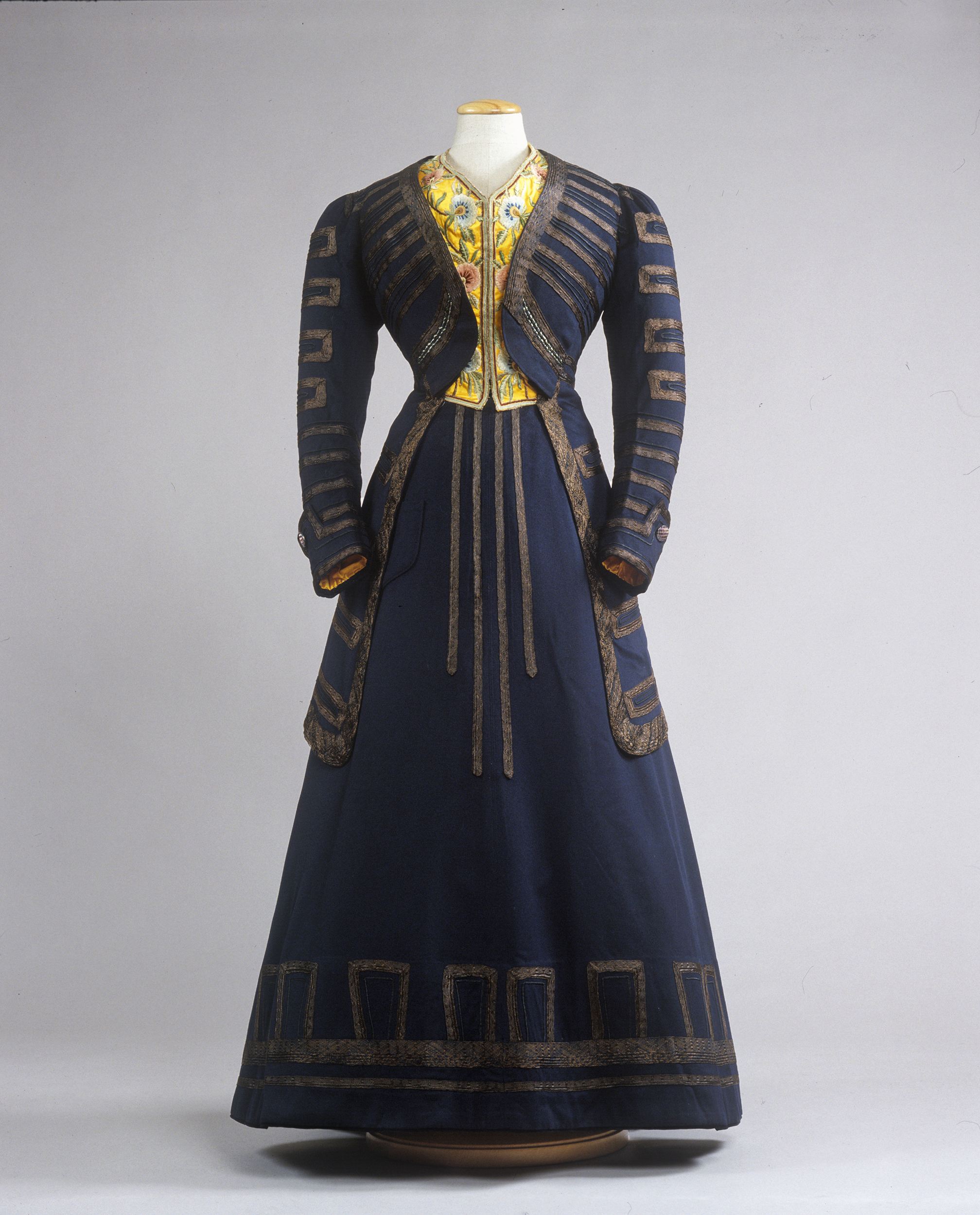 Questo completo è realizzato in morbido panno di lana, un materiale, la lana, che nella moda femminile fino a pochi decenni prima era ritenuto inadatto a un abbigliamento elegante e che ritrovavamo unicamente in abiti da viaggio o da lavoro, ma che all’inizio del XX secolo viene nobilitato, ed è utuilizzato anche in abiti da giorno di alta sartoria, solitamente impreziosito da elaborati ricami in applicazione. In questo caso giacca e gonna sono decorati dall’applicazione di spighette e soutache, ossia sottili passamanerie intrecciate, in seta marrone e blu che formano motivi geometrici su giacca e gonna. La giacca è lunga, a redingote, ossia stretta in vita e svasata nella parte inferiore - dall’inglese riding coat, giacca per cavalcare - e priva di allacciatura. Gli alti polsini e il centro dietro del girovita sono decorati da grandi bottoni metallici. La gonna, svasata, ha una piccola tasca sul lato destro, parzialmente nascosta dalla falda della giacca, forse da utilizzare per un fazzoletto o un orologio da taschino. Il tailleur è completato da un falso gilet in taffetas di seta giallo decorato da ampi ricami in filo di seta a motivi floreali che creano un vivace contrasto con la severità del completo. Per ultimare l’ensemble, un abito come questo era indossato sopra ad una camicetta, o spesso solo un davantino, con un alto colletto steccato in merletto o tulle, che fasciava il collo e completava la scollatura.