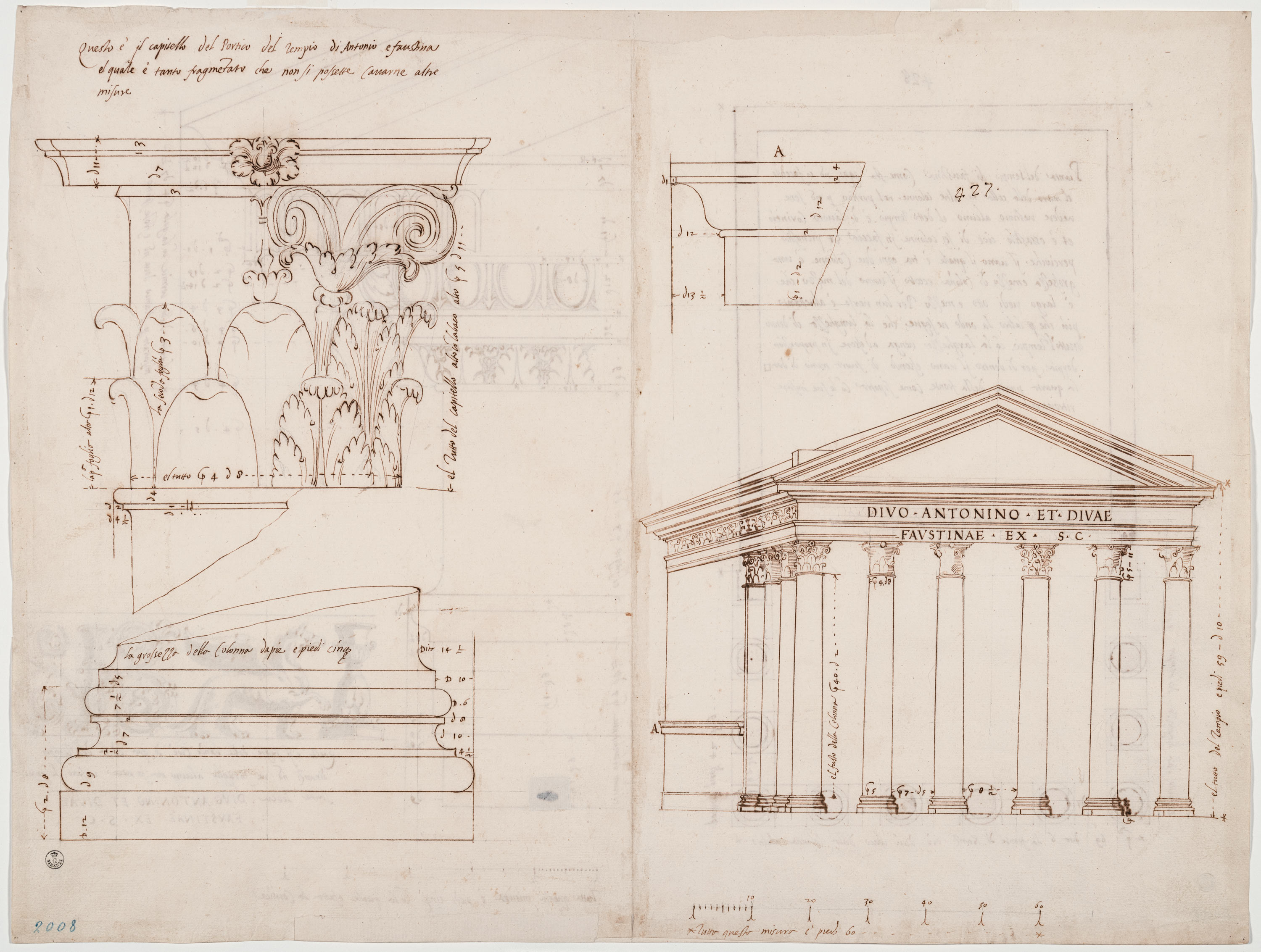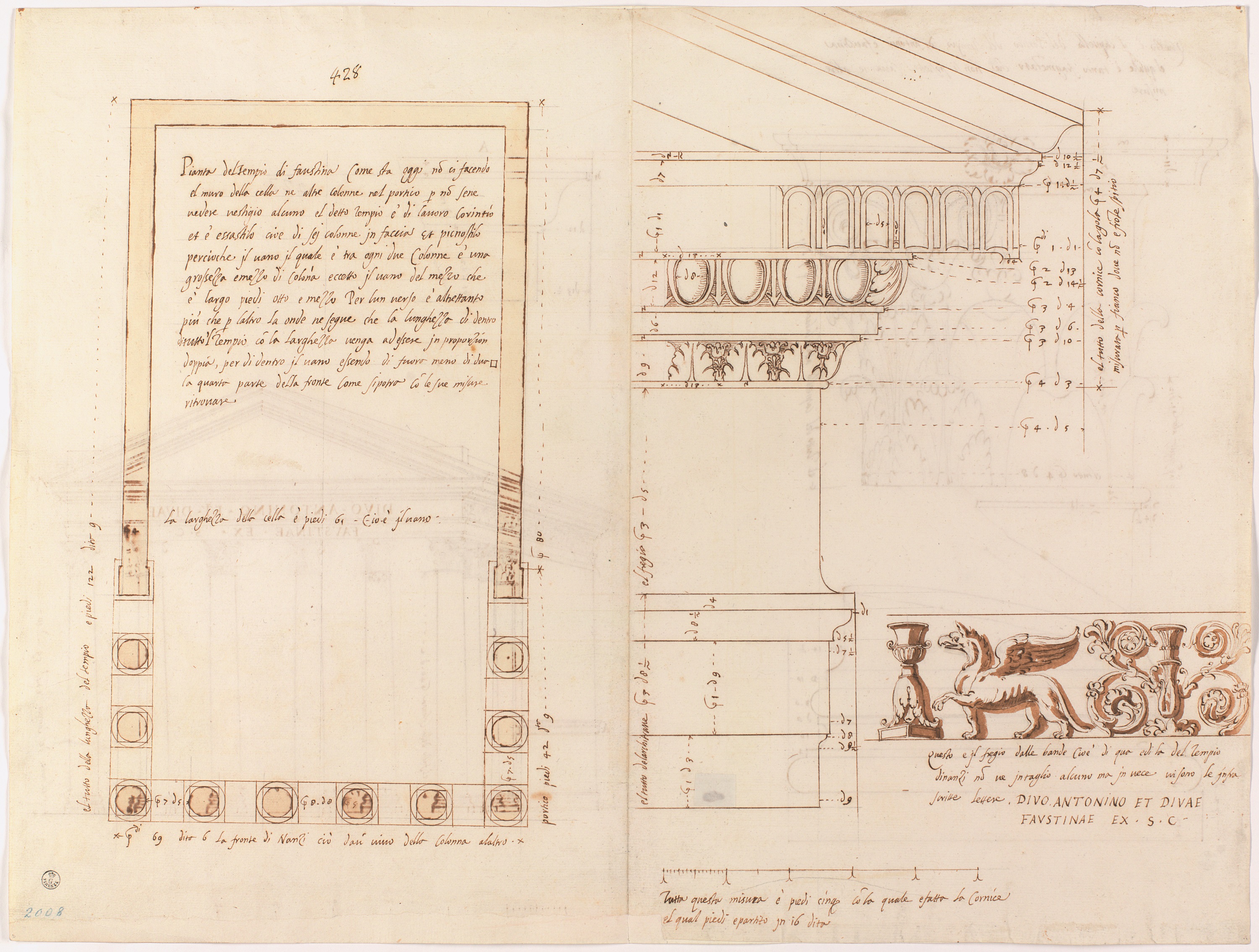 L’architetto senese offre una visione completa dell’edificio con cui si confronta, comprensiva di misure e quote, basata sulla scelta programmatica di riprodurre l’antico senza aggiunte volte a completare il frammentario. Sul recto del foglio sono raffigurate, da sinistra a destra, la pianta del tempio, con specifiche notazioni, i particolari della trabeazione e il fregio laterale, sotto il quale si trova la trascrizione della dedica in onore dei due imperatori, riprodotta correttamente, se non per la collocazione della parola divae nella prima riga: Divo Antonino et / Divae Faustinae ex s(enatus) c(onsulto) (CIL VI 1005 = CIL VI 31224). Sul verso del medesimo foglio, di lato all’ingrandimento di uno dei capitelli è infine disegnato l’alzato del monumento, comprensivo di iscrizione, trascritta secondo la stessa divisione in linee. Un’immagine che consente di apprezzare pienamente l’imponenza dell’edificio originariamente dedicato a esaltare la figura della sola Faustina Maggiore, eletta a diva tutelare della famiglia imperiale al potere, il cui ruolo centrale nella propaganda del marito appare ancor più evidente se si considera il luogo in cui il tempio sorto per celebrarla era stato eretto, quel foro romano che per secoli era stato reputato uno spazio quasi esclusivamente maschile.