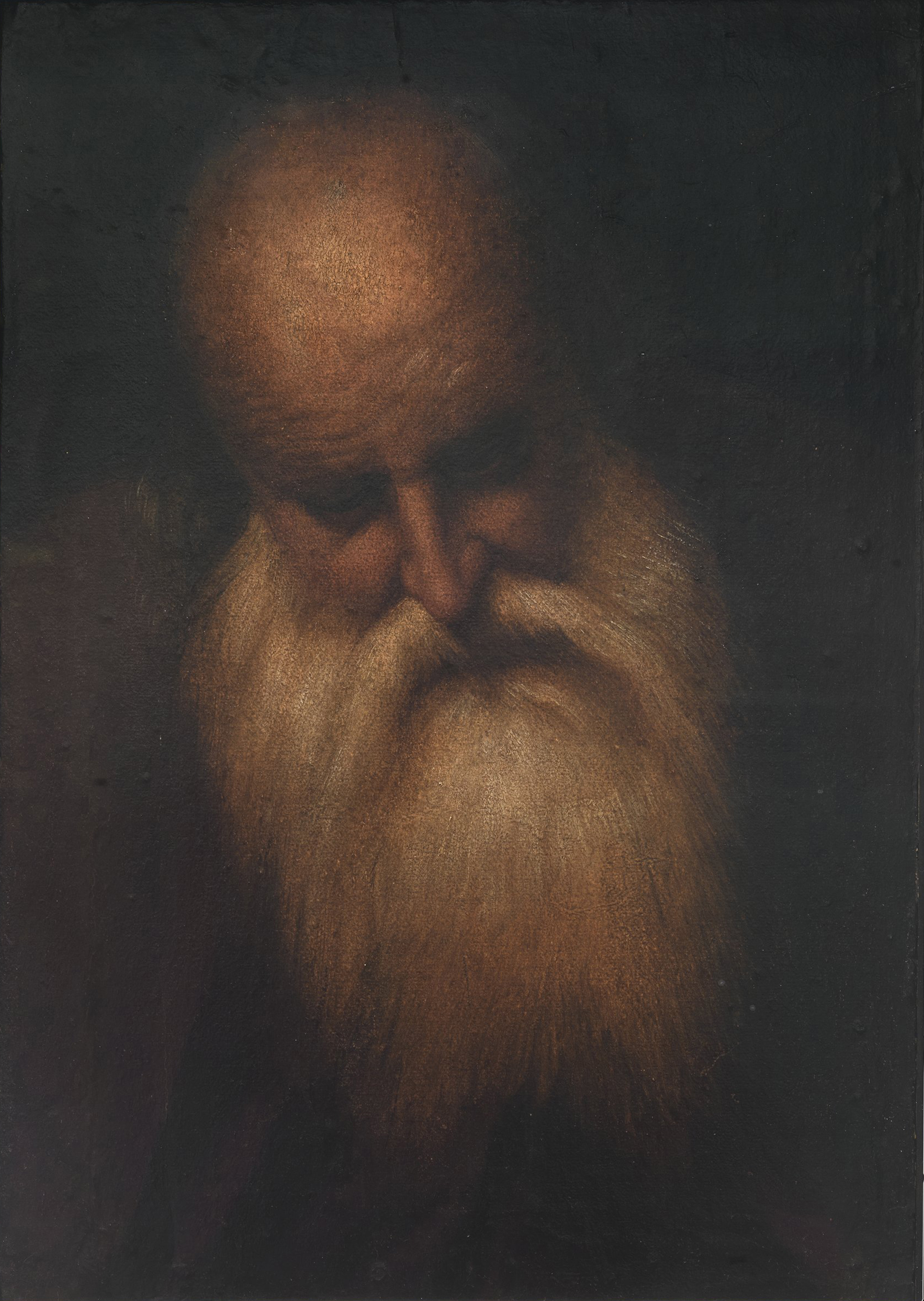 Questo dipinto di piccole dimensioni è uno studio ritrattistico della testa di un uomo anziano, raffigurato secondo i canoni iconografici propri dei santi o dei filosofi. La testa calva e la folta e lunga barba bianca sono, infatti, caratteristiche tipiche di questi personaggi, così come le spalle incurvate e lo sguardo rivolto verso il basso: tratti che connotano un atteggiamento di meditazione, pentimento, riflessione spirituale o intellettuale. La resa naturalistica del personaggio è tale per cui quasi si avvertono vere e proprie sensazioni tattili: sembra di percepire la levigatezza del capo glabro, la lieve increspatura del sottile reticolato delle rughe sulla fronte e attorno agli occhi, la morbidezza della barba che pare avere la consistenza materica della bambagia, la ruvidezza del tessuto grezzo dell'abito di modesto valore che egli indossa.