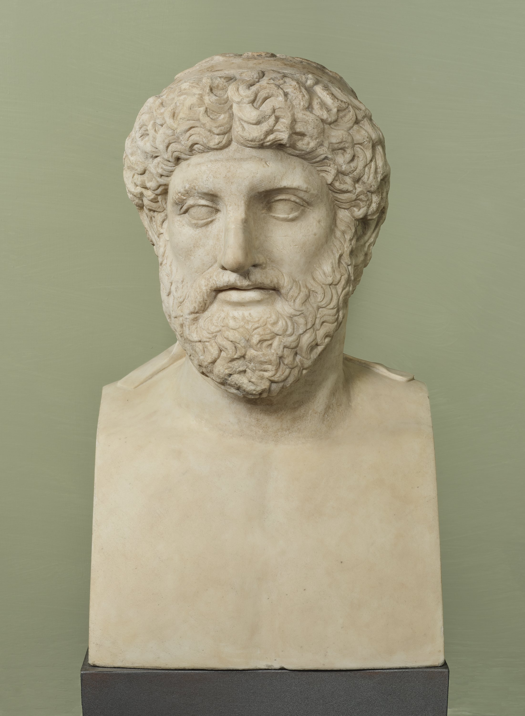 Alla metà dell’Ottocento in quest’erma fu ravvisata un’immagine di Sofocle. È probabile che l’originale sia da ricercare in una scultura di bronzo del V secolo a.C., come suggerirebbero il taglio angolare delle sopracciglia, la resa metallica delle palpebre e quella scriminata delle ciocche.