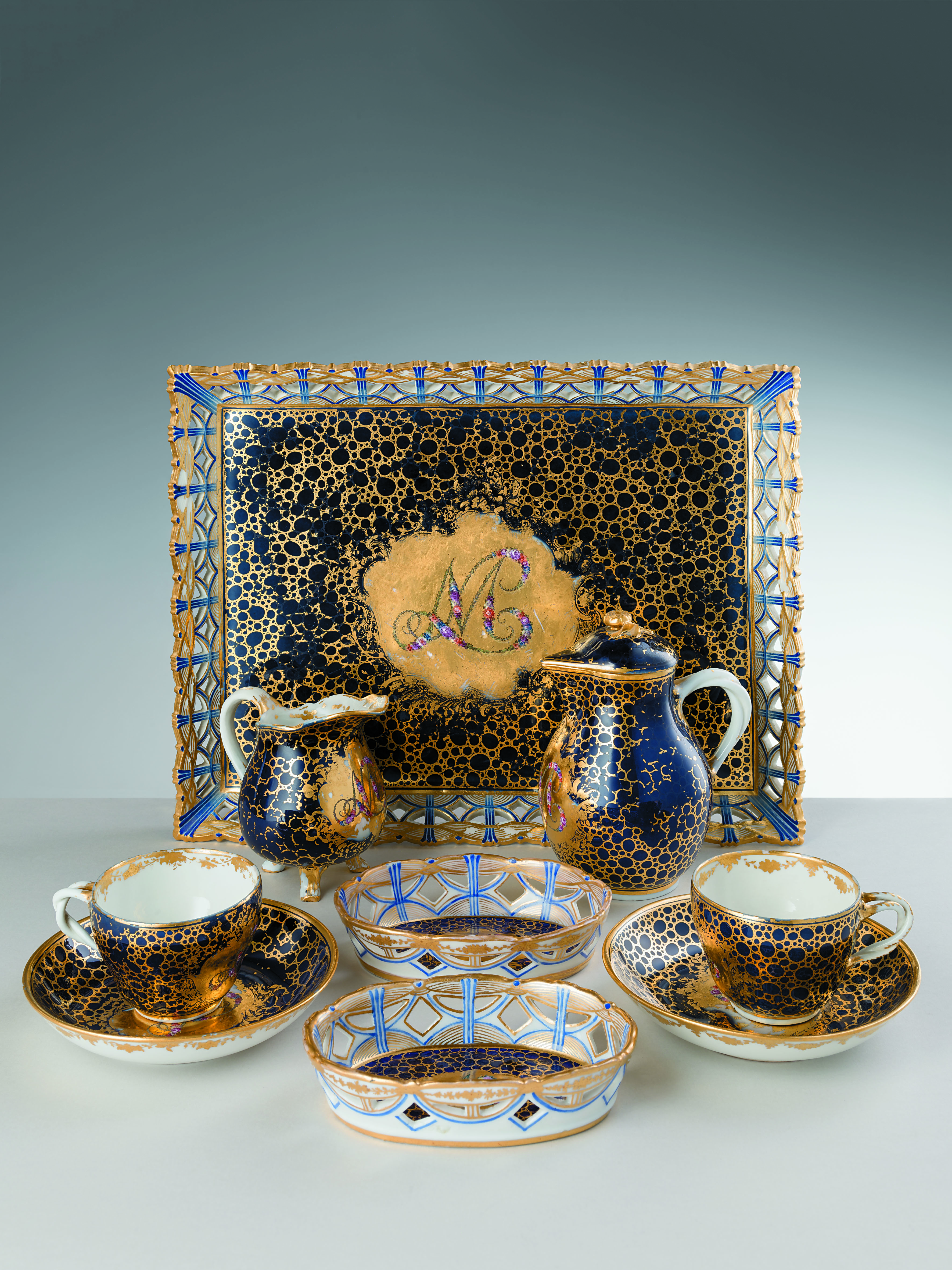 Il servizio trae ispirazione da esemplari realizzati dalle Manifatture di Vincennes e di Sèvres intorno al 1755-1760 e in particolare da quelli inviati nel 1758 da Luigi XV re di Francia a Maria Teresa d’Austria in seguito all’alleanza da loro sancita nel 1757, durante la guerra di successione austriaca e rafforzata con il matrimonio avvenuto nel 1770 della figlia dell’imperatrice, Maria Antonietta con Luigi XVI, il Delfino di Francia. Si tratta del donativo di tre servizi, di cui uno da portata, uno da dessert e uno da caffè per la colazione, che poteva essere variato con quello da tè oppure da cioccolata. Questi déjeuners, destinati alla degustazione di bevande esotiche, ebbero una larga fortuna fin dal Settecento presso le Corti e poiché venivano sovente regalati potevano essere personalizzati con le iniziali del nome della persona a cui erano destinati. Ne costituisce un esempio il monogramma “ML” rappresentato sul nostro esemplare con una raffinata ghirlanda di fiorellini finemente miniati. Evidente è la dedica a Maria Luisa, figlia di Don Carlos di Borbone e moglie di Pietro Leopoldo Asburgo Lorena, ma non sono note le motivazioni del suo arrivo nella Reggia di Palazzo Pitti, poiché ne abbiamo notizia negli inventari solamente dal 1795.