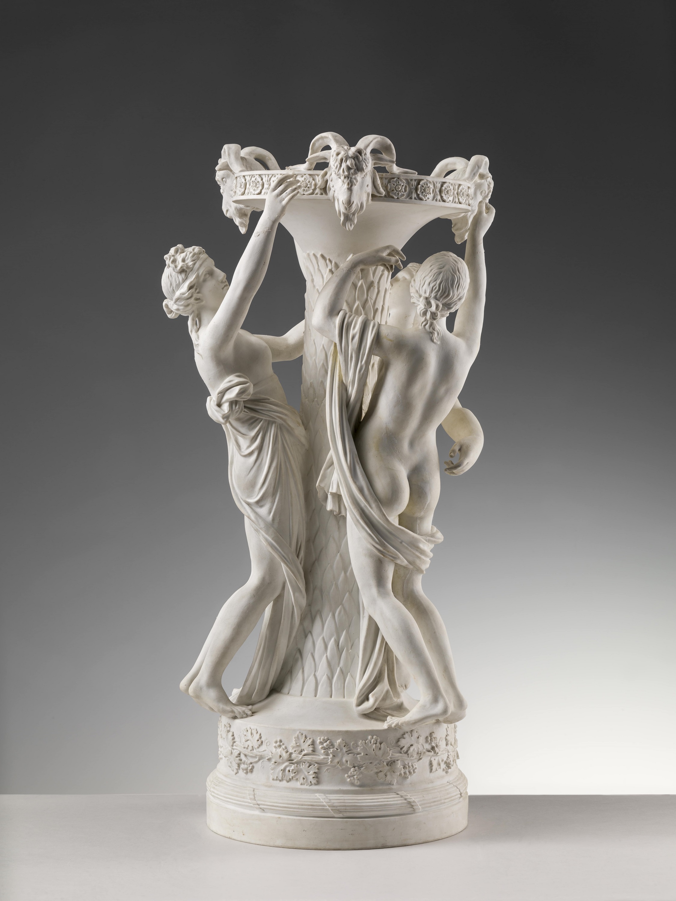 Il gruppo con le Tre Grazie, ovvero Aglaia, Eufrosine e Talia, ancelle di Venere e figlie di Giove, trae ispirazione da un marmo antico conservato all’epoca a Villa Borghese a Roma, reso noto attraverso l’incisione di Giovan Battista Piranesi contenuta nel repertorio a stampa Vasi, Candelabri, Cippi, Sarcofagi del 1778. Rispetto ad altre sculture destinate all’apparecchiatura della tavola di Pietro Leopoldo (inv. A.c.e 1911 n. 217, 639), questo ha le caratteristiche di un centrotavola dove il “cestino” decorato con protomi caprine potrebbe assolvere alla funzione di contenitore per composizioni di frutta o floreali.