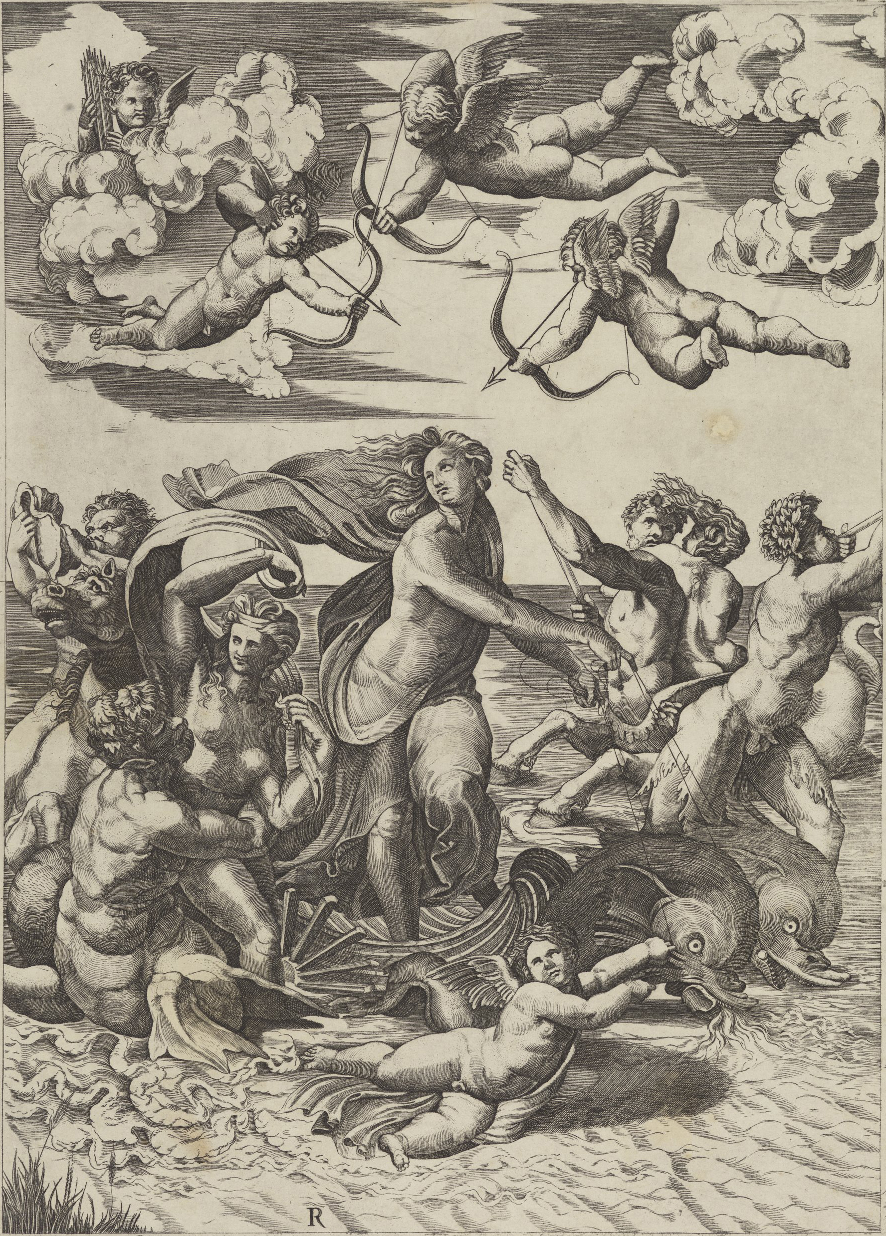 Il celebre affresco, dipinto da Raffaello nel 1512 nella villa suburbana di Agostino Chigi, fu presto oggetto di numerose trascrizioni grafiche, promosse dall’artista stesso in un efficace sistema di diffusione dei propri modelli tramite le stampe. Oltre a fonti figurative della scultura classica, Raffaello per la rappresentazione della ninfa seguì nell’affresco, più che l’iconografia dei testi antichi, le scene del suo trionfo ispirandosi direttamente alle rime delle “Stanze per la Giostra”, composte da Angelo Poliziano intorno al 1475-78 con aperti intenti di celebrazione della famiglia de’ Medici.