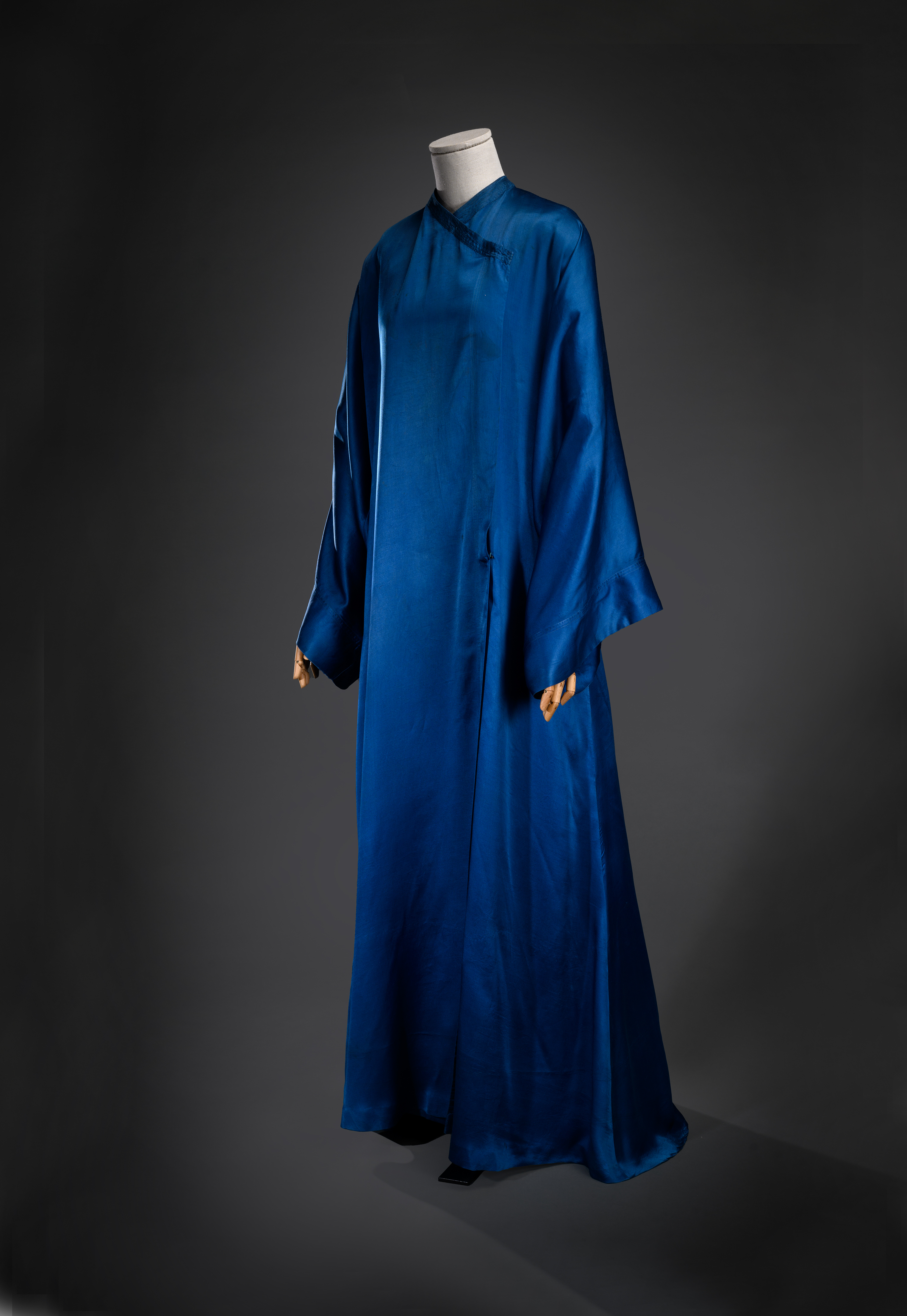 Lunga tunica di linea ampia e svasata, in quattro teli di raso di seta di colore blu cobalto, interamente aperta sul davanti e con chiusura soprammessa e asimmetrica allo scollo, lievemente a V, e all’altezza della vita. Le maniche, ampie e rettangolari, sono lunghe ai polsi. La tunica faceva parte del guardaroba di Eleonora Duse ed è riconducibile al secondo decennio del Novecento, periodo in cui la diva rimase lontana dalle scene, prima di un nuovo, folgorante ritorno negli anni Venti.