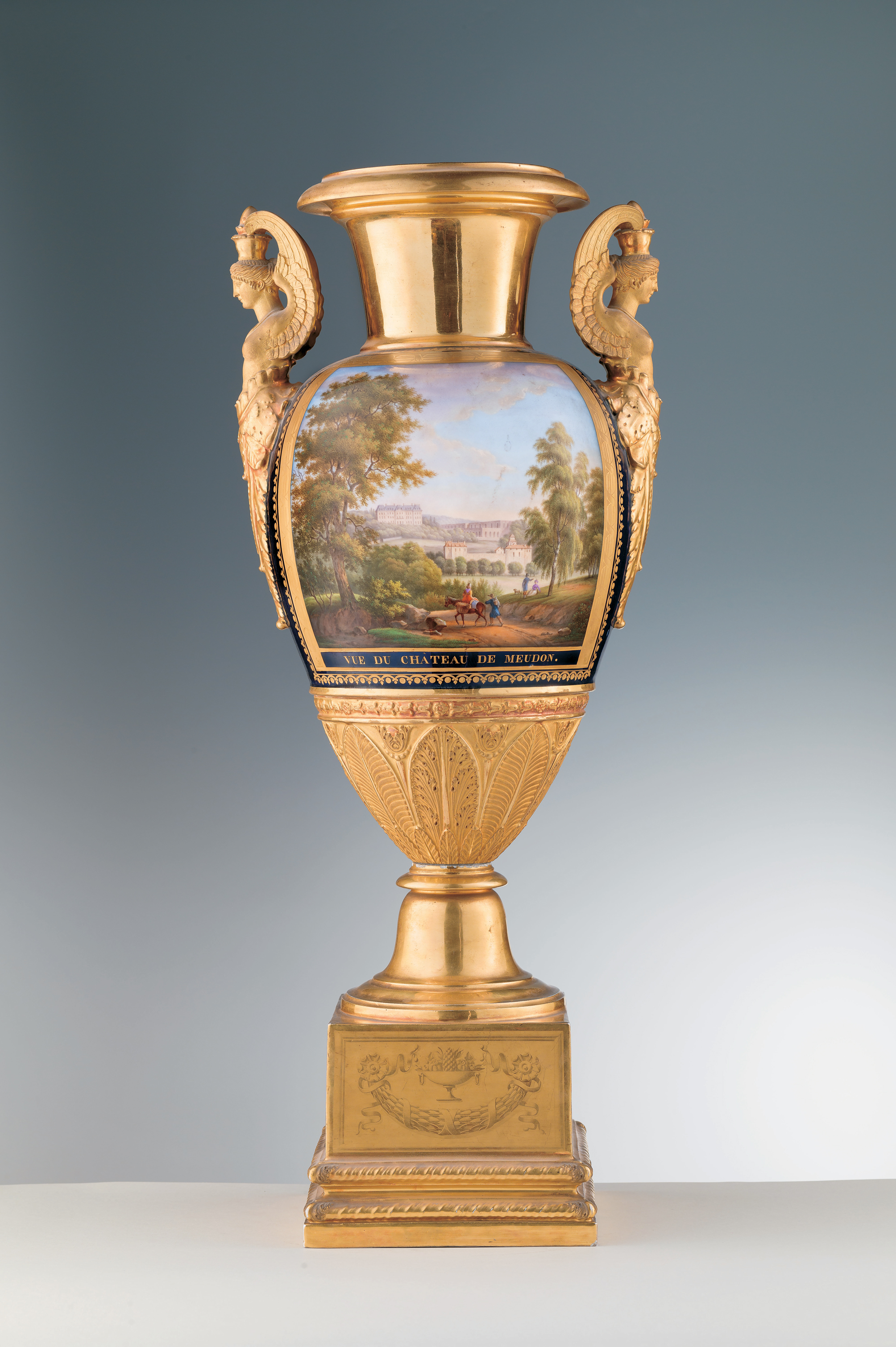 I nostri esemplari di forma ovoidale sono fissati su un alto basamento, che conferisce loro slancio ed eleganza, e presentano anse modellate come Nike, vittorie alate pettinate all’antica. La loro presenza, unitamente all’uso dell’oro lucido e opaco che riveste la superficie dei vasi, allude al lusso delle corti alle quali questi modelli erano destinati. La nostra coppia è pervenuta a Palazzo Pitti dalla Villa di Marlia a Lucca, mentre si ha notizia di un’altra coppia simile acquistata da Luigi XVIII alla citata Esposizione al Louvre del 1823.