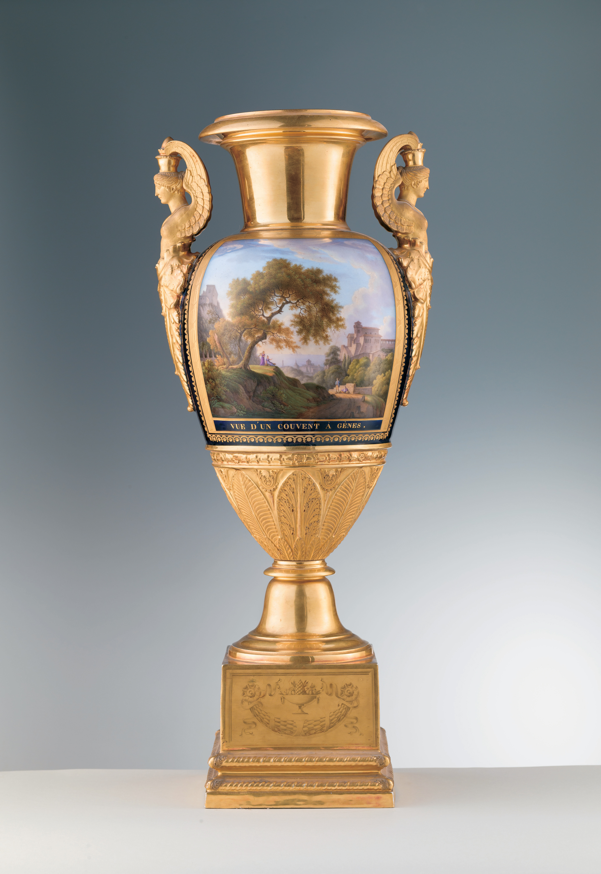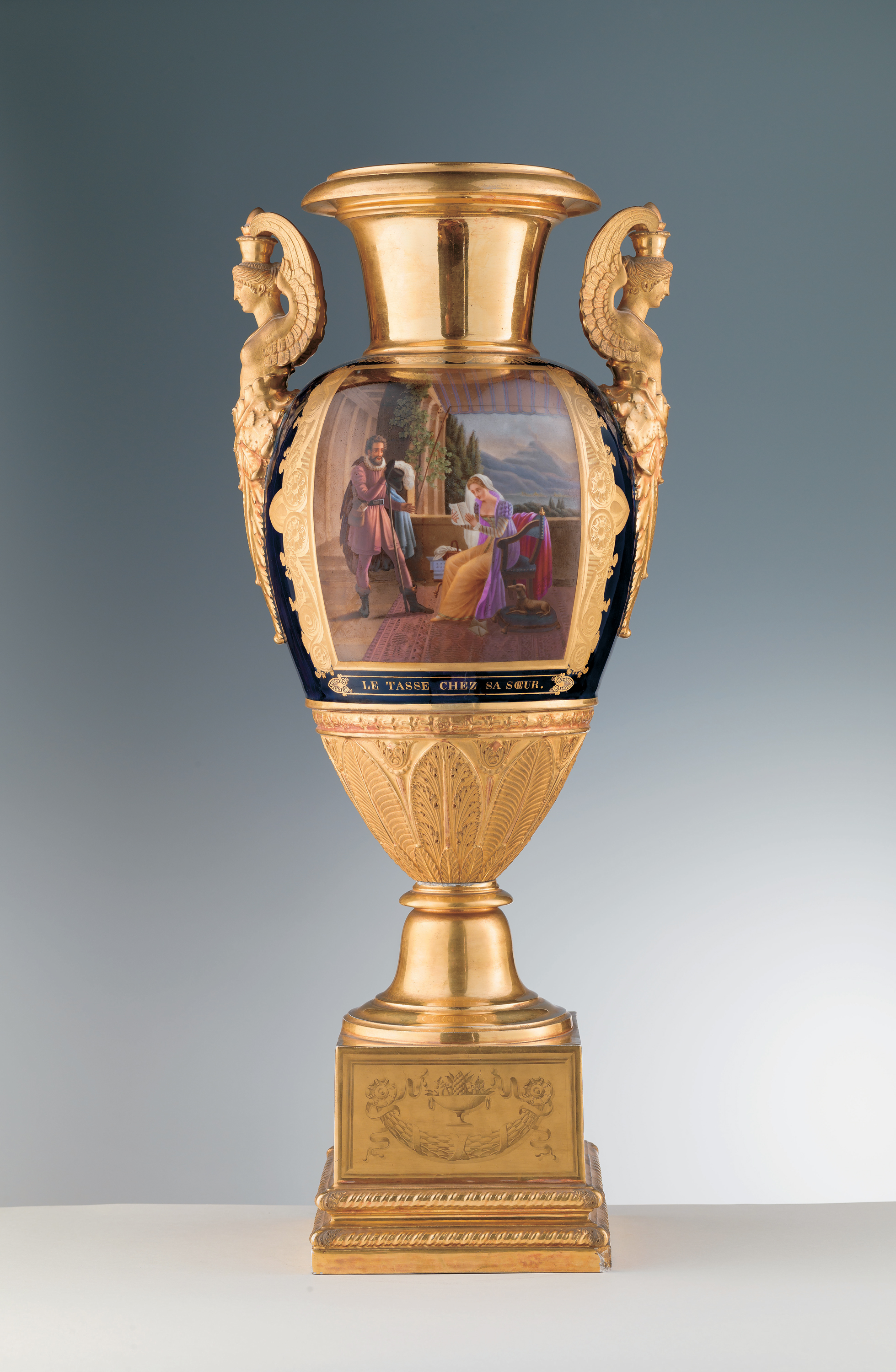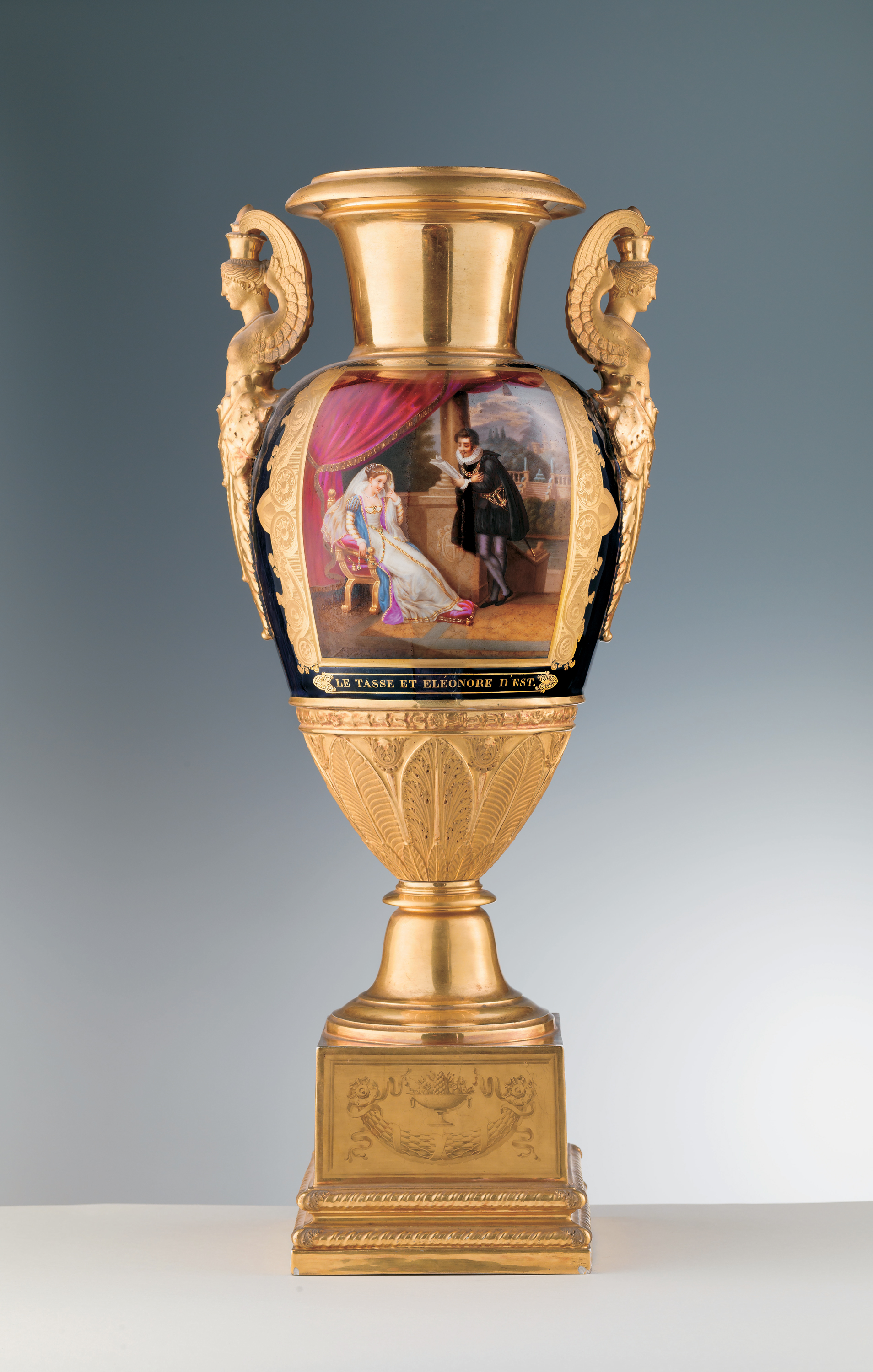 I corpi dei vasi sono decorati con una scena raffigurante sul lato principale un episodio della vita del poeta Torquato Tasso arricchito da una preziosa cornice dorata, mentre sull’altro è riprodotta la veduta del Castello di Meudon e la veduta di un convento a Genova. Le rappresentazioni di Tasso che legge i suoi versi a Eleonora d’Este e Tasso a casa della sorella sono tratti pressoché fedelmente da due dipinti di Jean-Louis Ducis eseguiti nel 1812 ed esposti al Salon del 1814. Questi fu allievo di Jacques-Louis David da cui apprese la pittura di storia, che unì alla ritrattistica e alla rappresentazione di scene mitologiche. Interessante è la sua adesione allo stile “Troubadour” riscontrabile nelle due citate tele appartenute alla moglie di Luigi Bonaparte, Hortense Eugénie Cécile, che portò con sé durante il suo esilio ad Arenenberg, dove tuttora si trovano conservate nell’attuale Musée Napoléon Thurgovie.