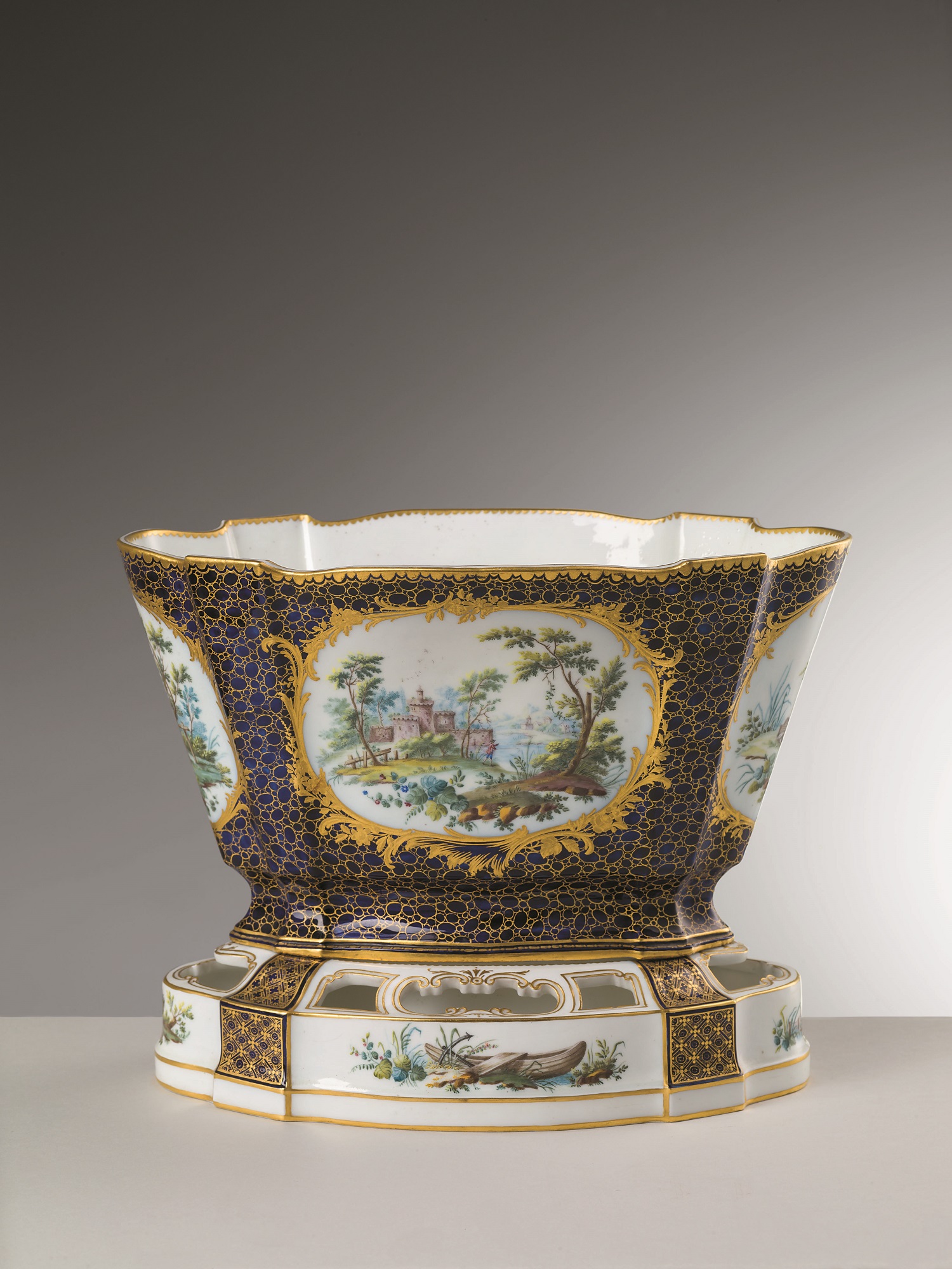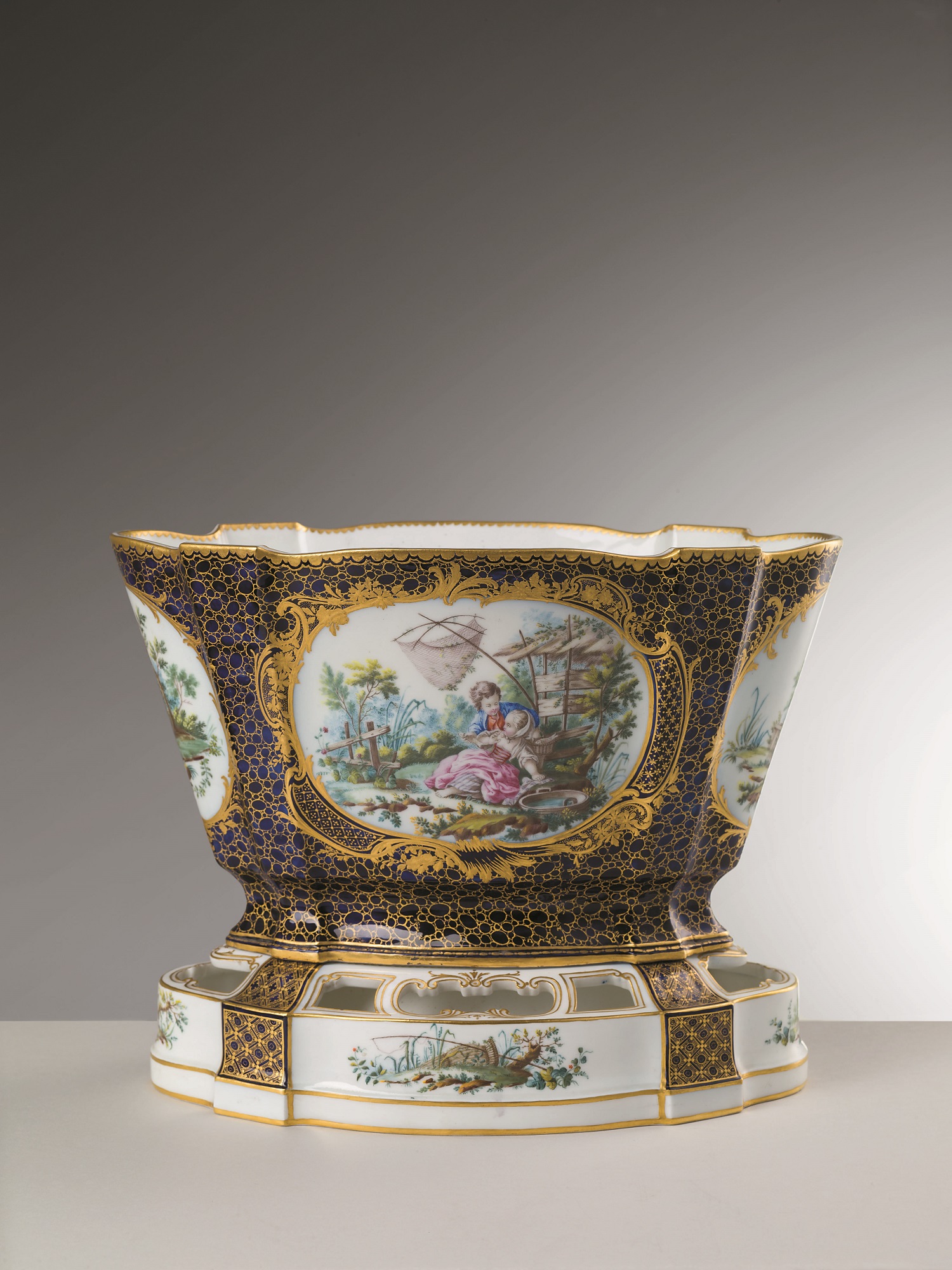 L’esemplare è costituito da due parti: un vaso porta fiori e una vasca con la funzione di piede per il vaso stesso. Quest’ultimo è caratterizzato da una campitura blu scura definita “lapis”, che riveste la superficie esterna esaltando il candore della porcellana visibile sia all’interno che sulla vasca, il cui decoro è arricchito da filettature in oro che incorniciano, immersi nella vegetazione, elementi alludenti alla pesca, evidente richiamano alla scena principale inscritta in una cartouches sul corpo del vaso. Si tratta di una riproposta, seppur con varianti, de La pêche dipinta da François Boucher e nota in fabbrica attraverso un’incisione di Jean-Baptiste Le Prince. La Manifattura di Vincennes prima e quella di Sèvres in seguito, hanno dimostrato particolare attenzione alle composizioni del pittore francese Boucher, come rivelato anche da alcune statuette in biscuit impiegate per la decorazione di tavole da dessert, di cui si hanno esempi nel Museo delle porcellane (inv. A.c.e. 1911, nn. 1404, 1406, 1412-1415, 1651-1652).