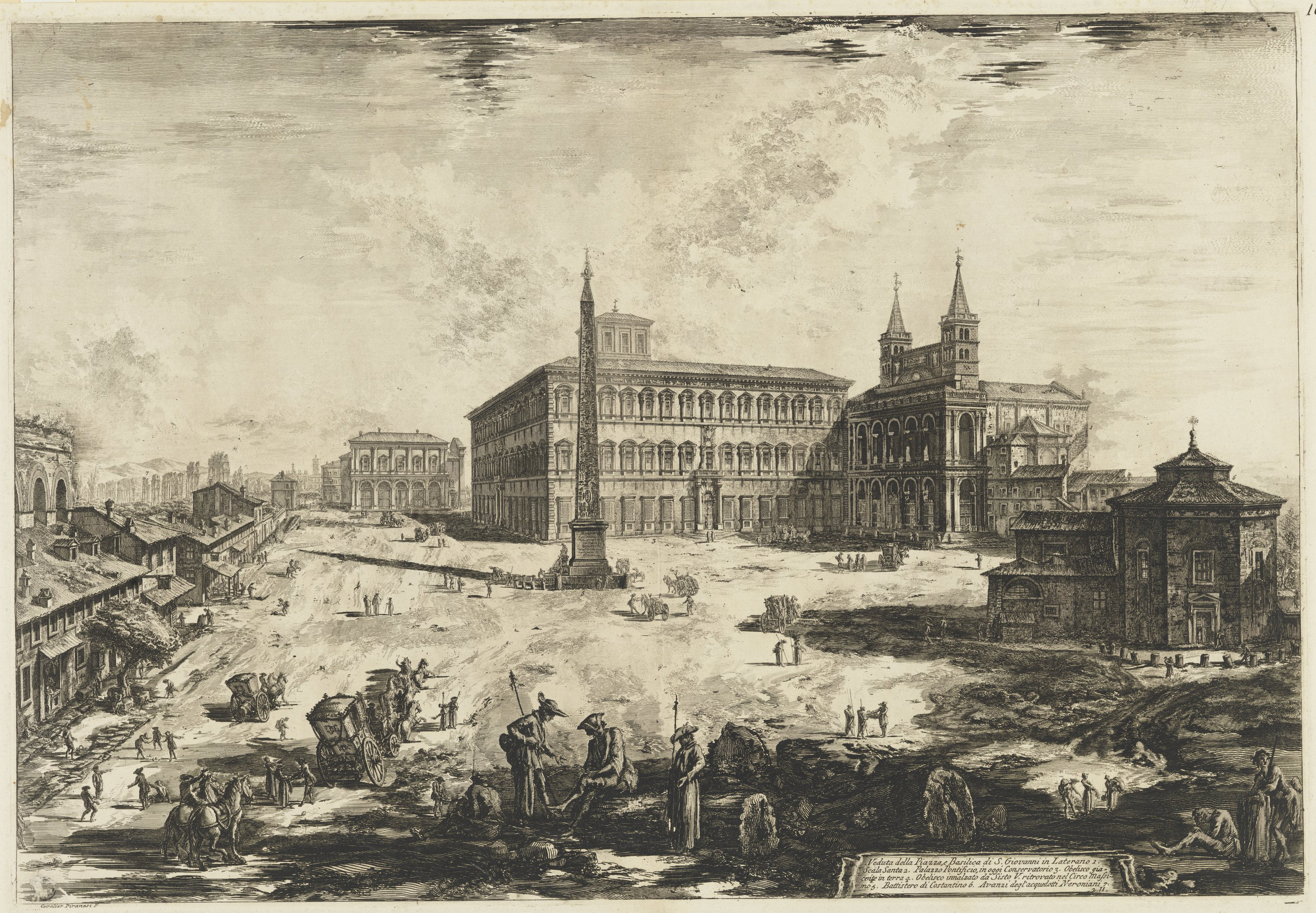 Ideale corrispettivo delle vedute con S. Pietro e il Vaticano, nello splendore della sua ambientazione urbanistica, questa tarda tavola delle ‘Vedute di Roma’ rivela quanto il complesso lateranense apparisse nel Settecento ancora meta lontana di un percorso poco frequentato nelle usuali direttrici del turismo, ultima tappa urbana di un pellegrinaggio antico praticato solo nelle festività, ma per lo più isolato ai margini delle mura aureliane. In antitesi con la visione monumentale e moderna della basilica del Laterano offerta da Piranesi in molte altre occasioni, qui la veduta isola invece, in uno spazio aperto, le architetture trasformate dal radicale intervento urbanistico operato sotto Sisto V. In asse col complesso della Scala Santa, la ripresa prospettica è chiusa a sinistra da una quinta di edilizia minuta, sintomo della perifericità della basilica prima dell’urbanizzazione dell’Esquilino in epoca postunitaria. La necessità compositiva di limitare il primo piano in ombra lascia spazio a un raro compiacimento per l’aneddoto attraverso il disporsi di figure umane di inusuale grandezza, come il gruppo dei pellegrini in riposo, o colte con colorita arguzia nel brulicare delle più varie occupazioni, come i giocatori di bocce o i giovani che seguono le carrozze, campionario di una sempre nuova commedia umana.