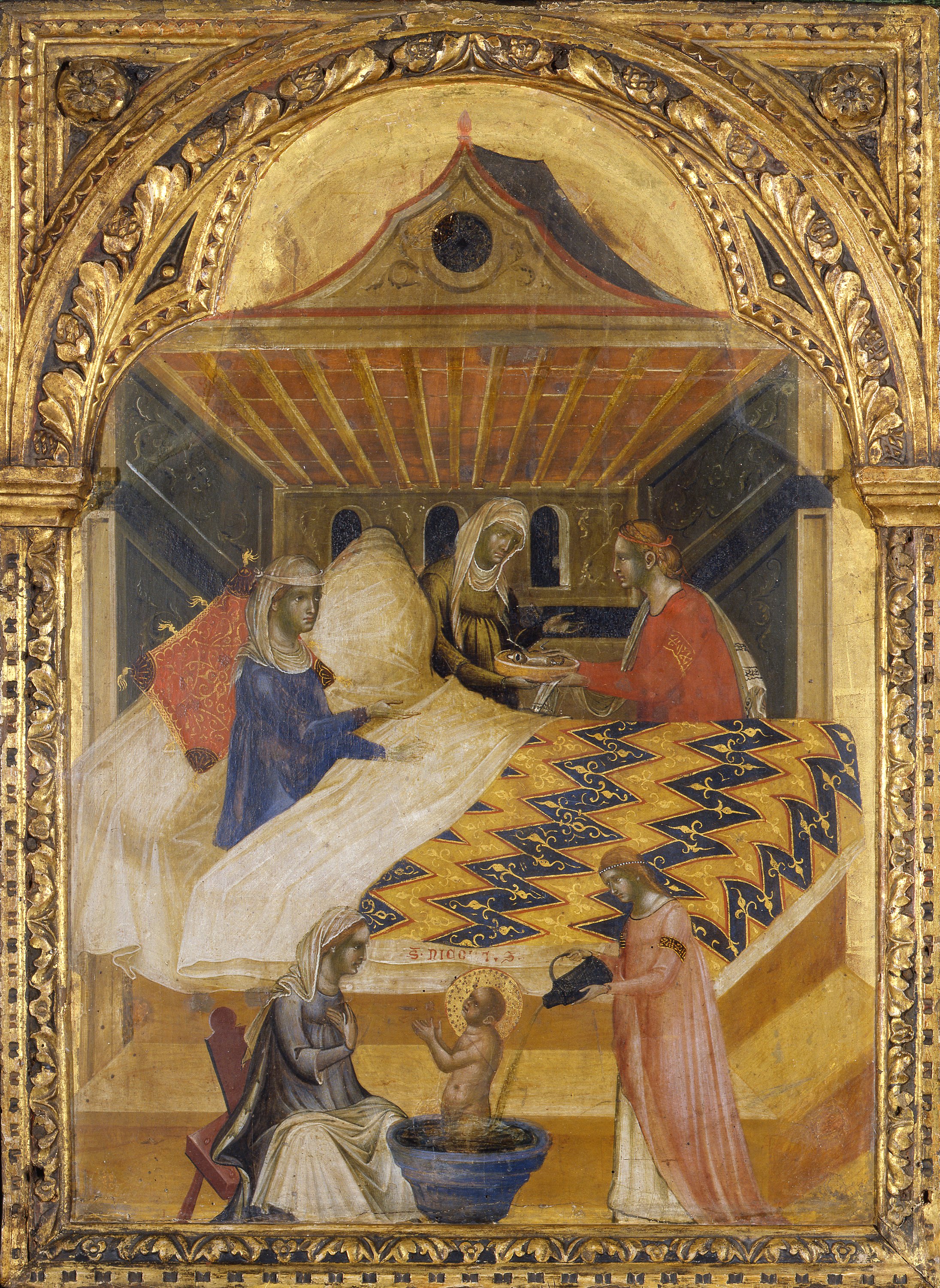 La tavola illustra la nascita di san Nicola e la sua santità: seppure appena nato, il bimbo si tiene prodigiosamente in piedi da solo per pregare, fra la meraviglia delle donne che lo accudiscono. Il miracolo avviene mentre il santo sta ricevendo il primo bagno, davanti alla levatrice che ha steso sulle ginocchia l’asciugamano per avvolgere il neonato. Un’iscrizione col nome del santo, S. NICOLAUS, corre sopra l’aureola del bambino. Sullo sfondo, nel letto, la madre di Nicola viene rifocillata dopo il parto da due donne che le portano una pietanza ristoratrice.
