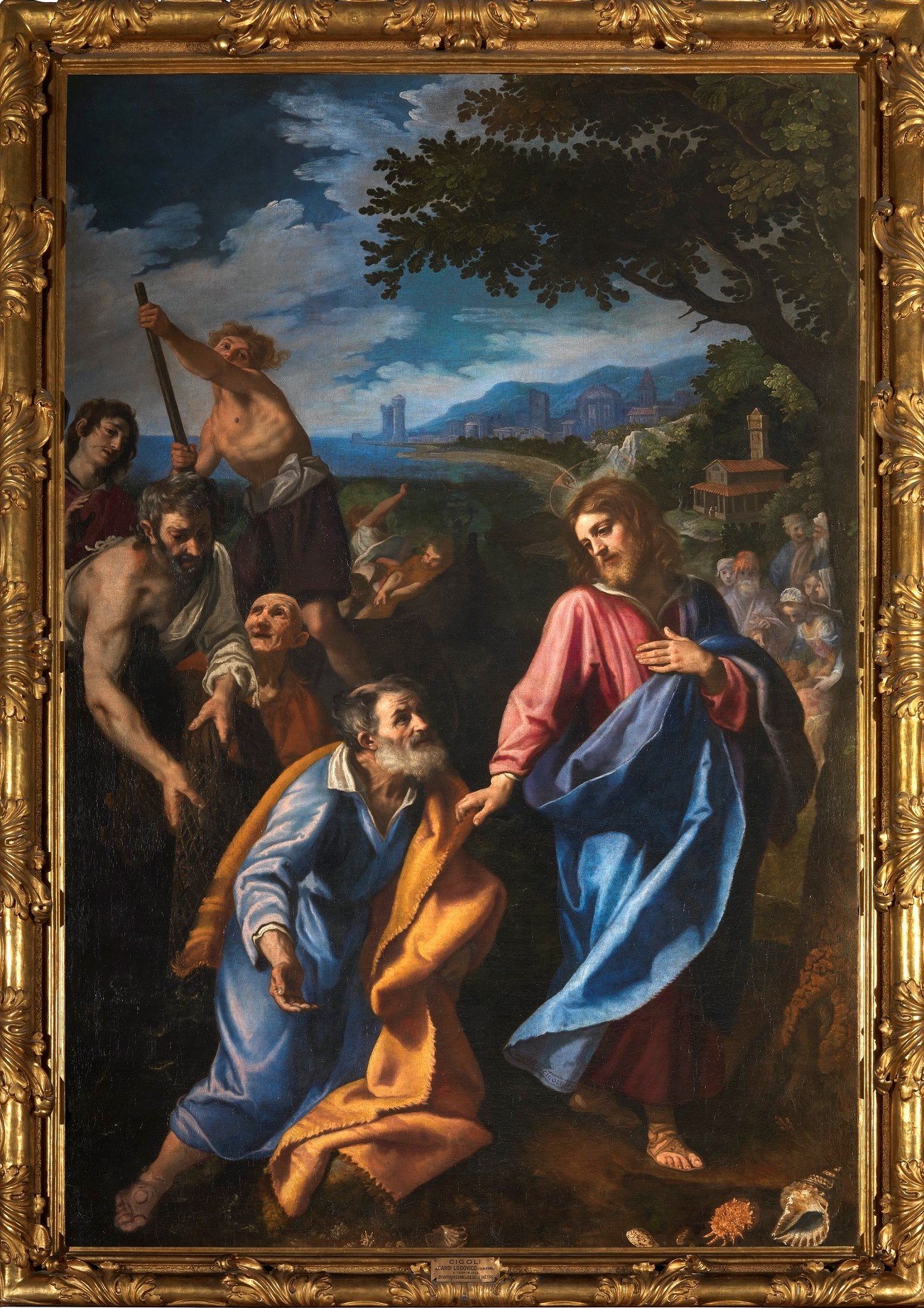 La scena illustra l’incontro di Gesù con due pescatori, Simone e Andrea, avvenuto sulle rive del lago di Tiberiade e seguito dall’invito a lasciare ogni cosa per seguirlo nel suo cammino. Nel quadro generale della narrazione evangelica, questo episodio è centrale poiché rappresenta non solo l’inizio dell’attività di Gesù come predicatore, ma anche il fondamento della storia futura della religione cristiana. Simone e Andrea, infatti, sono destinati a portare avanti l’opera del loro maestro, dopo il tragico epilogo della sua vicenda terrena. Simone in particolare, proprio dal momento del primo incontro con il profeta viene da lui denominato Pietro, ricevendo la missione di fondare la futura chiesa di Roma. L’essenza di questo passaggio così solenne viene rappresentata in una composizione di grande chiarezza narrativa, in cui la sorvegliata disposizione dei personaggi permette allo spettatore di individuare con chiarezza il momento e cogliere primariamente l’intenso gioco di sguardi tra maestro al suo discepolo, laddove si rende manifesta a un tempo la rivoluzionaria richiesta di Gesù e la convinta adesione di quest’uomo semplice, pronto a diventare “pescatore di anime”. Eseguita entro il 1607 per il nobile Niccolò Carducci, agente del granduca Ferdinando I a Livorno, e destinata alla sua cappella nel duomo di quella città, questa tela dai blu e dai rosa teneramente ombreggiati, costruita su un impianto solenne che mette insieme l’impressione del naturalismo caravaggesco e la monumentalità della grande pittura tosco- romana cinquecentesca tra Andrea del Sarto, Raffaello per un verso e i Carracci per l’altro, è una delle opere più belle e tra le ultime del pittore pisano, scomparso nel 1608. Niccolò Carducci, che aveva allestito la cappella col consiglio del granduca Ferdinando, cedette la tela alla sua consorte Cristina di Lorena, nelle cui stanze a Pitti risultava esposta venti anni dopo la sua esecuzione, nel 1628. Da allora, la Vocazione di Pietro e Andrea non ha mai lasciato Pitti, venendo inserita nella sala di Venere al momento dell’apertura al pubblico del museo lorenese, nel 1828.